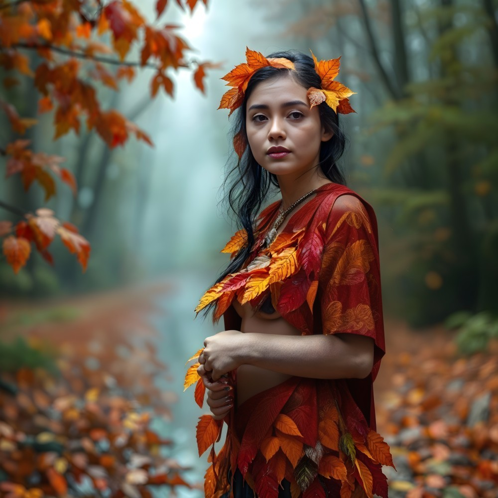 Prompt: Vibrant autumn leaves top and bottom, no normal clothing or fabric just leaves, revealing lots of skin, young female model, standing pose, rainy forest setting, fall foliage, misty atmosphere, earthy color palette, reds, oranges, yellows, browns, detailed leaf patterns, wet ground, raindrops on leaves, serene expression, mystical vibe, ethereal lighting, fantasy theme, digital art, high resolution, enchanting and surreal ambiance.