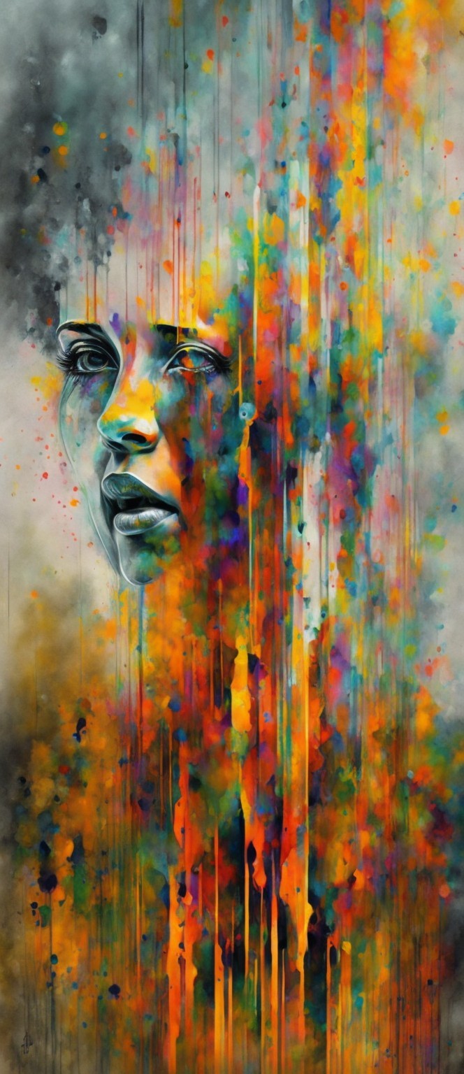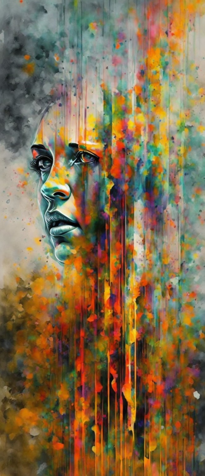 A striking portrait of a woman's face, blending with vibrant splashes of orange, purple, and green. The paint drips create a mesmerizing effect, merging realism with abstract art.