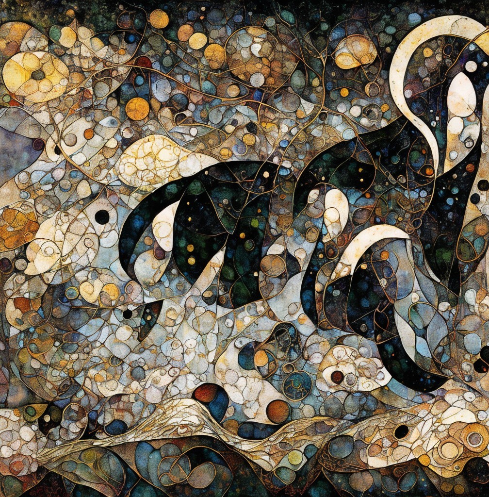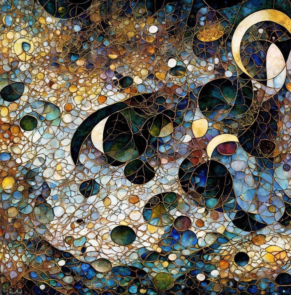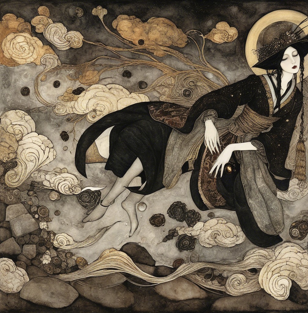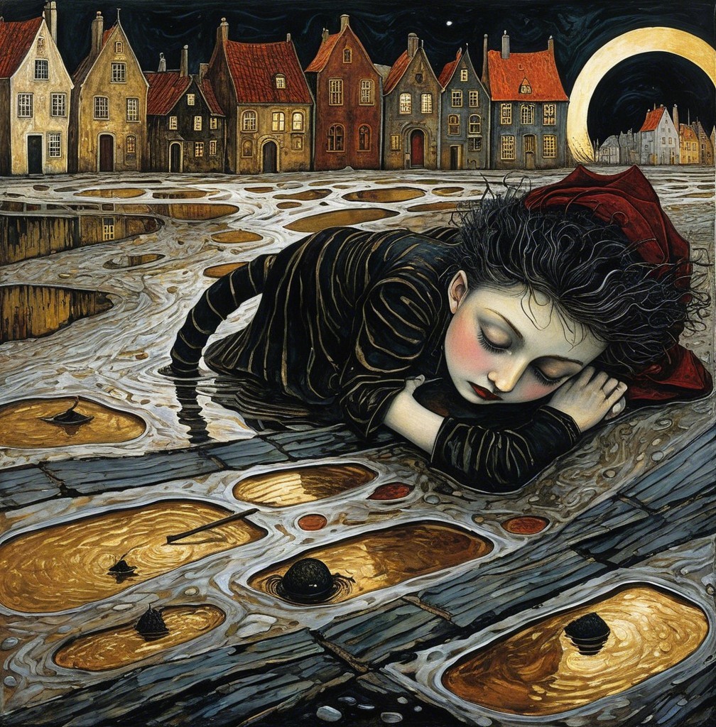A man in a long coat stands on golden puddles under a stone bridge, using a stick to probe the water. A black cat watches as colorful houses glow in the evening backdrop.