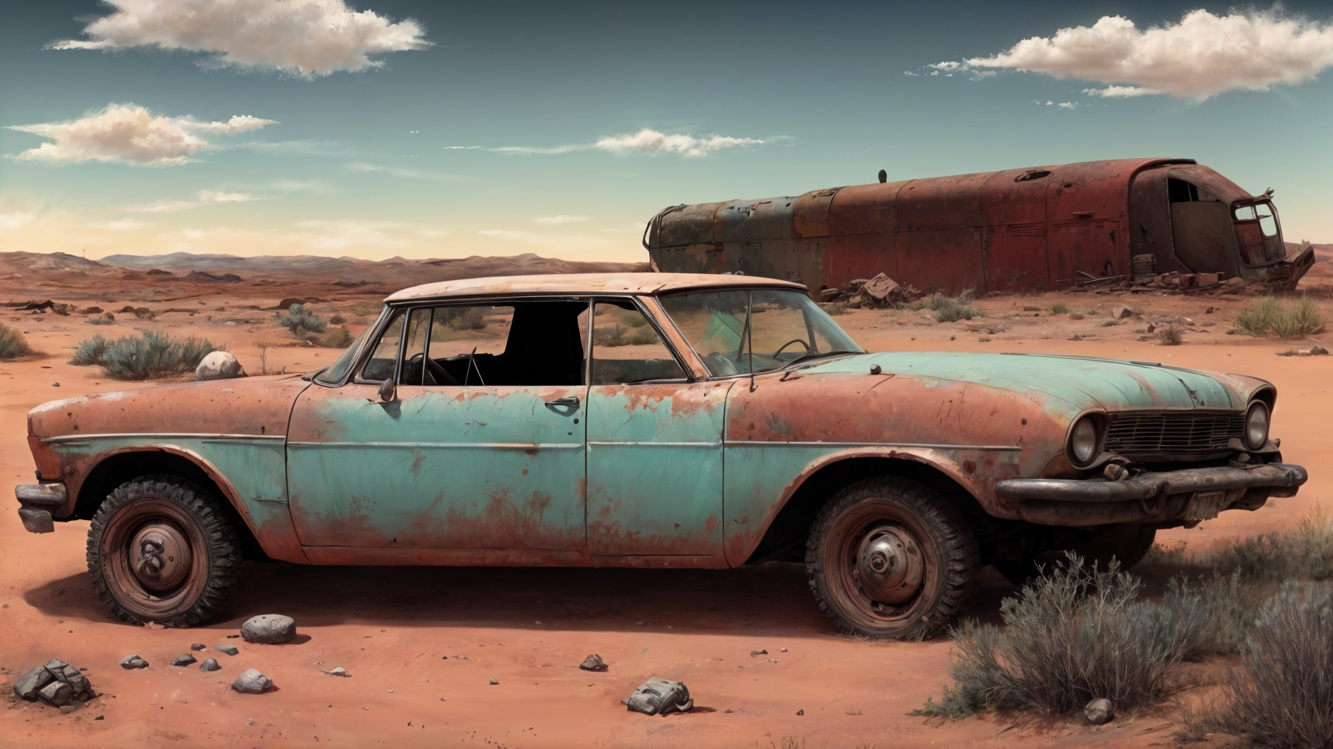 A vintage car, rusted and worn, sits in a desert landscape. Nearby, a dilapidated building leans, adding to the desolate, abandoned feel of the scene, with sparse vegetation around.
