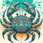 A vibrant, stylized crab with blue and teal hues features intricate swirls and patterns. Its claws are raised amidst colorful, swirling designs, creating a lively underwater theme.