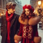 A stylish couple strolls through a snowy street, adorned in winter fashion. The man wears a chic coat and scarf, while the woman dazzles in a fur-collared red coat and beret, exuding warmth and romance.