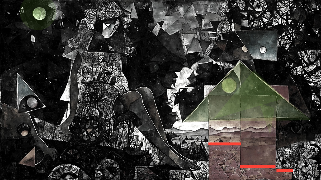 The image features a monochromatic scene with a somber figure in a geometric cloak, holding flowers. Abstract shapes and a mysterious landscape complement the haunting atmosphere.