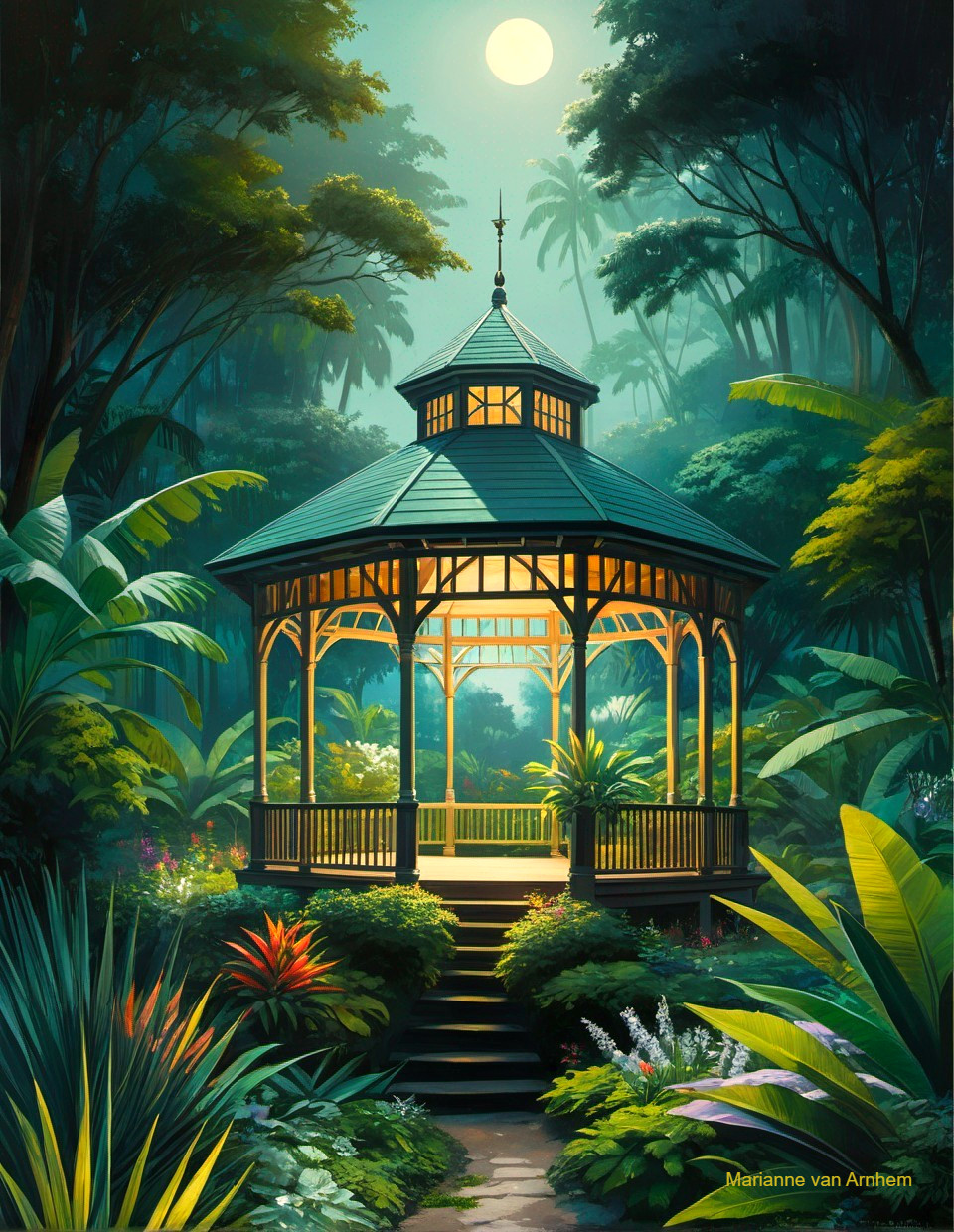 An idyllic gazebo bathed in soft light sits amidst a lush, vibrant jungle with the moon glowing gently above.