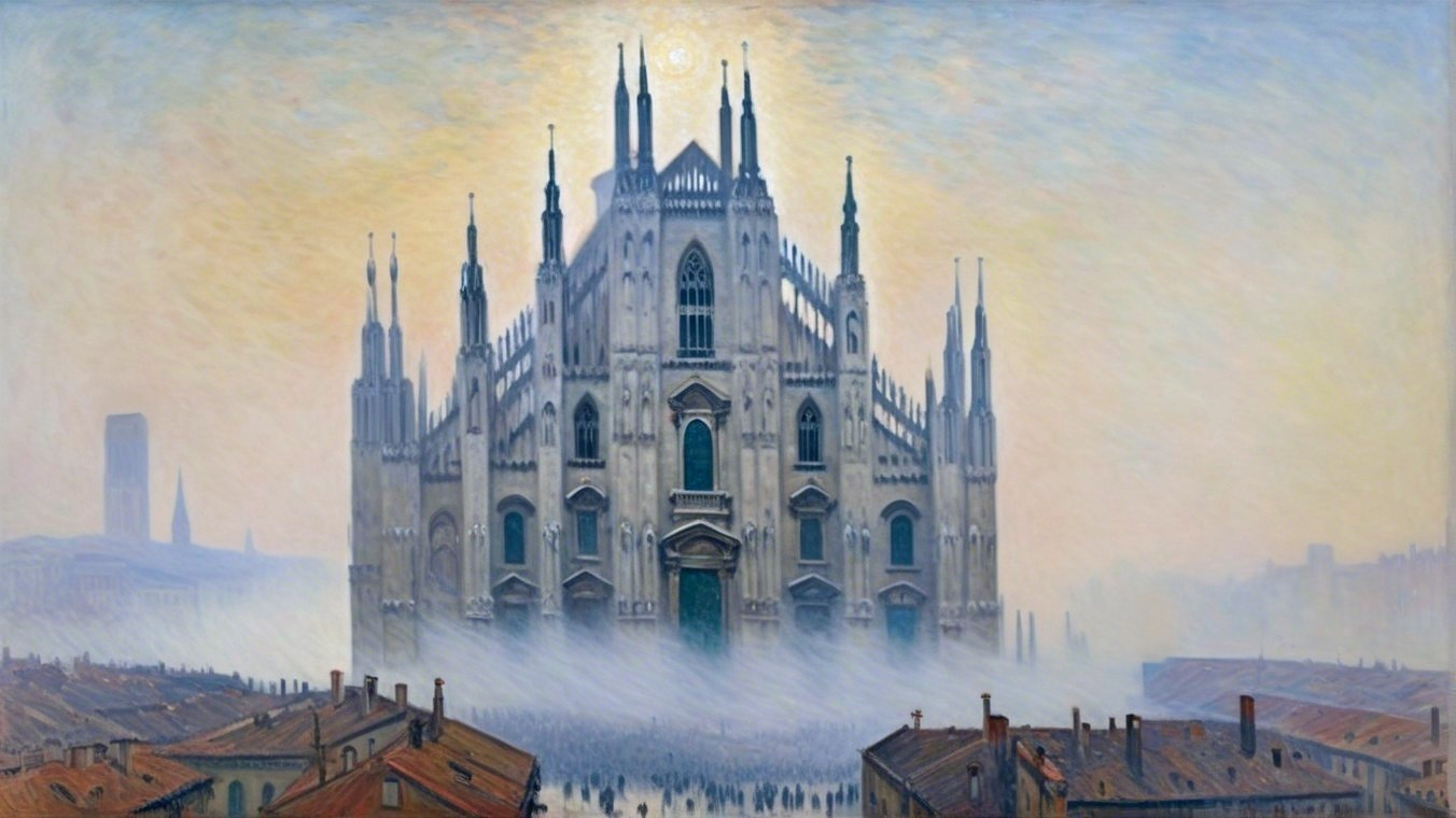 The Milan cathedral rises majestically against a pastel sky, enveloped in light fog. Nearby rooftops peek through the fog, while crowds gather below, creating an ethereal atmosphere.