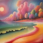 A vibrant, surreal landscape features colorful trees in shades of pink, orange, and blue lining a winding, rainbow-hued path under a swirling sky, evoking a dreamlike atmosphere.