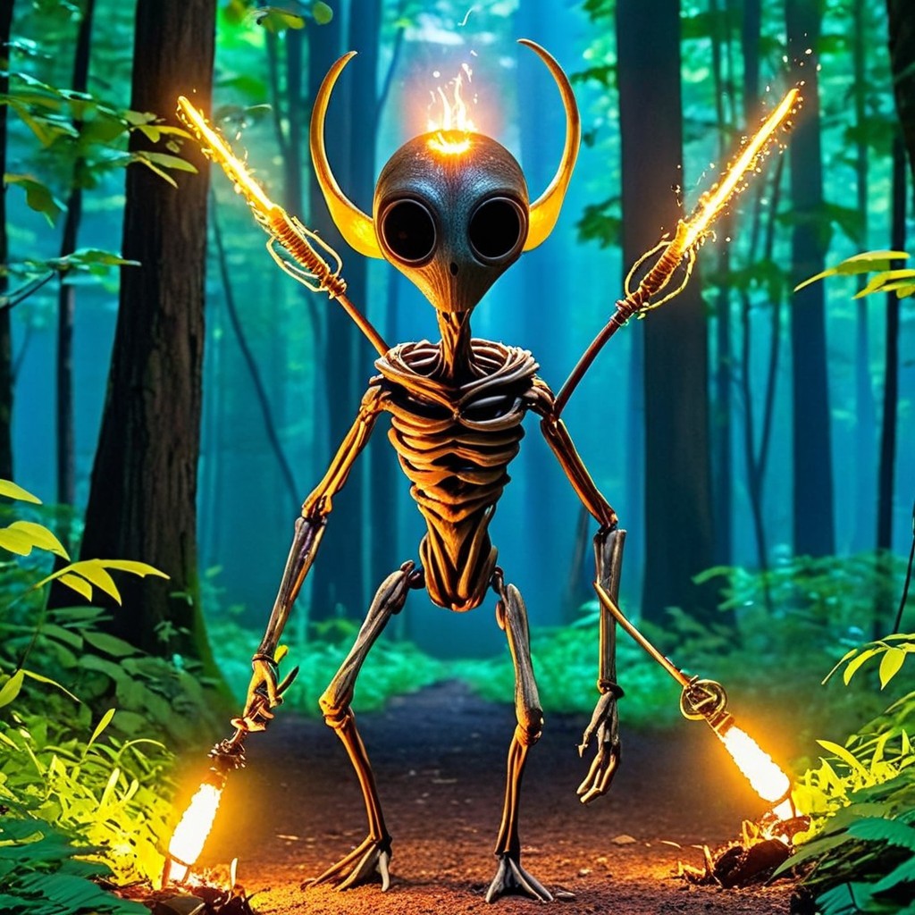 In a vibrant forest, a whimsical skeleton figure with oversized yellow eyes holds glowing eggs. The scene blends eerie charm with a touch of magic, surrounded by lush green foliage.