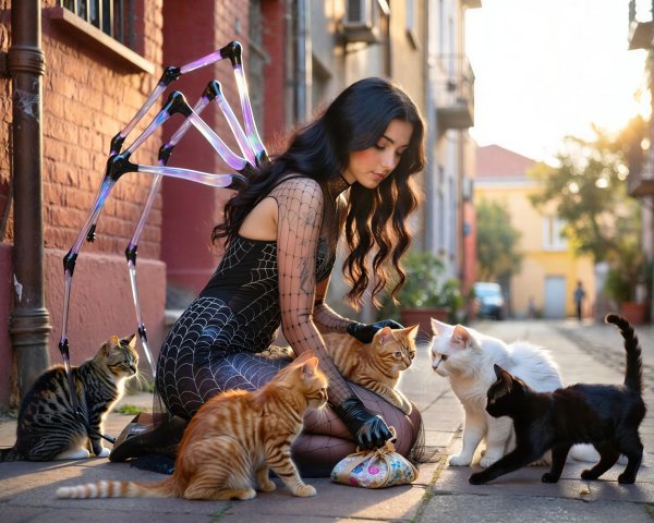 A mystical illustration of a cat with human features, blue-black fur, braided hair, and a moonlit starry sky backdrop.