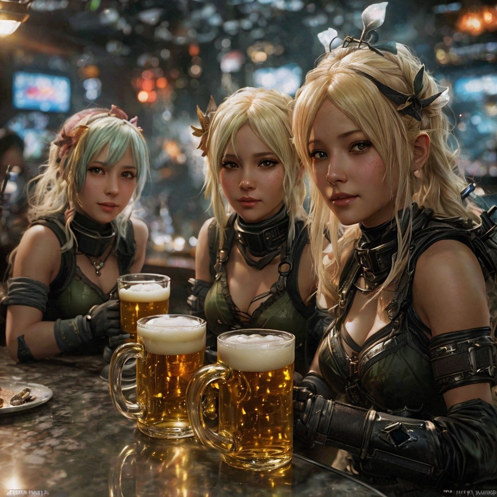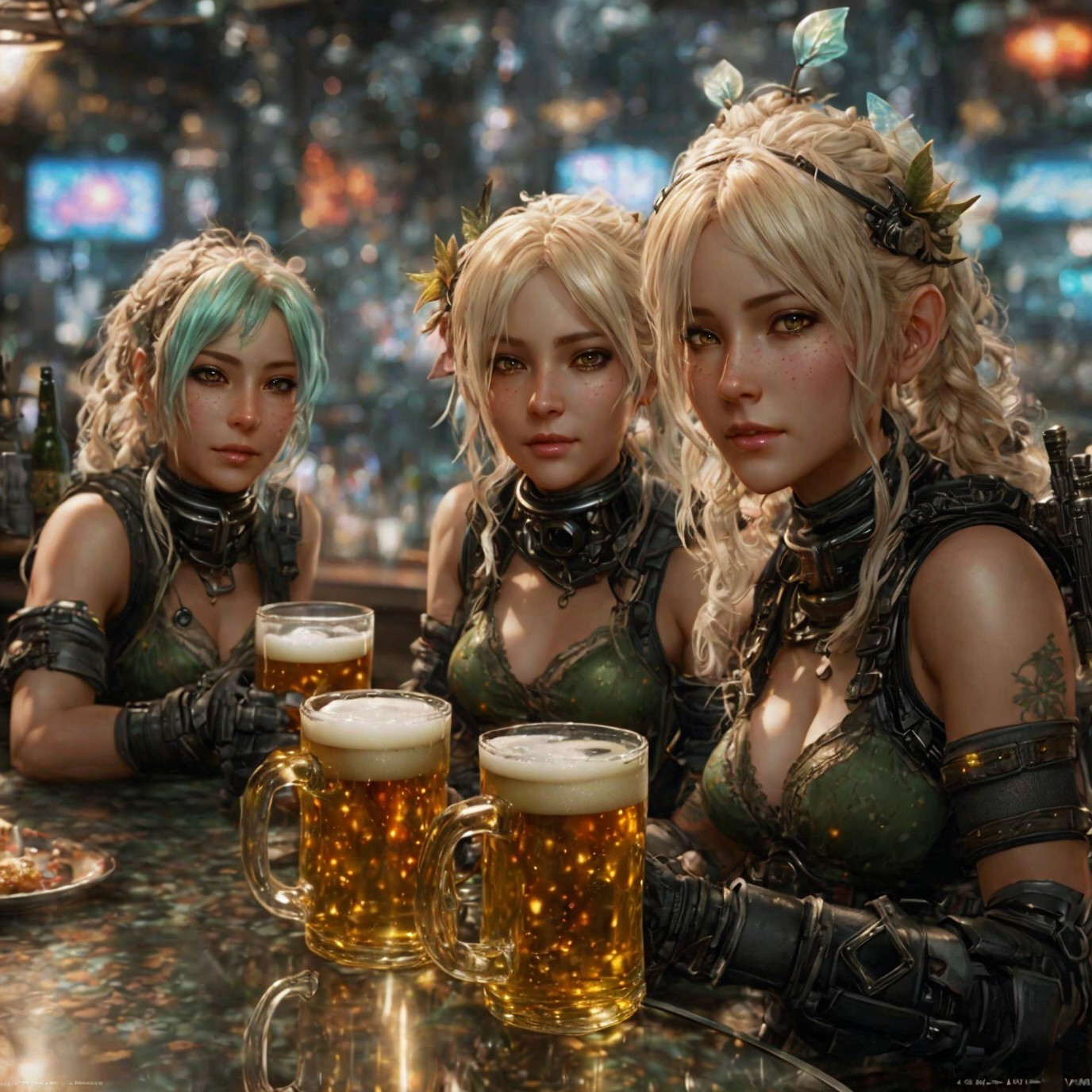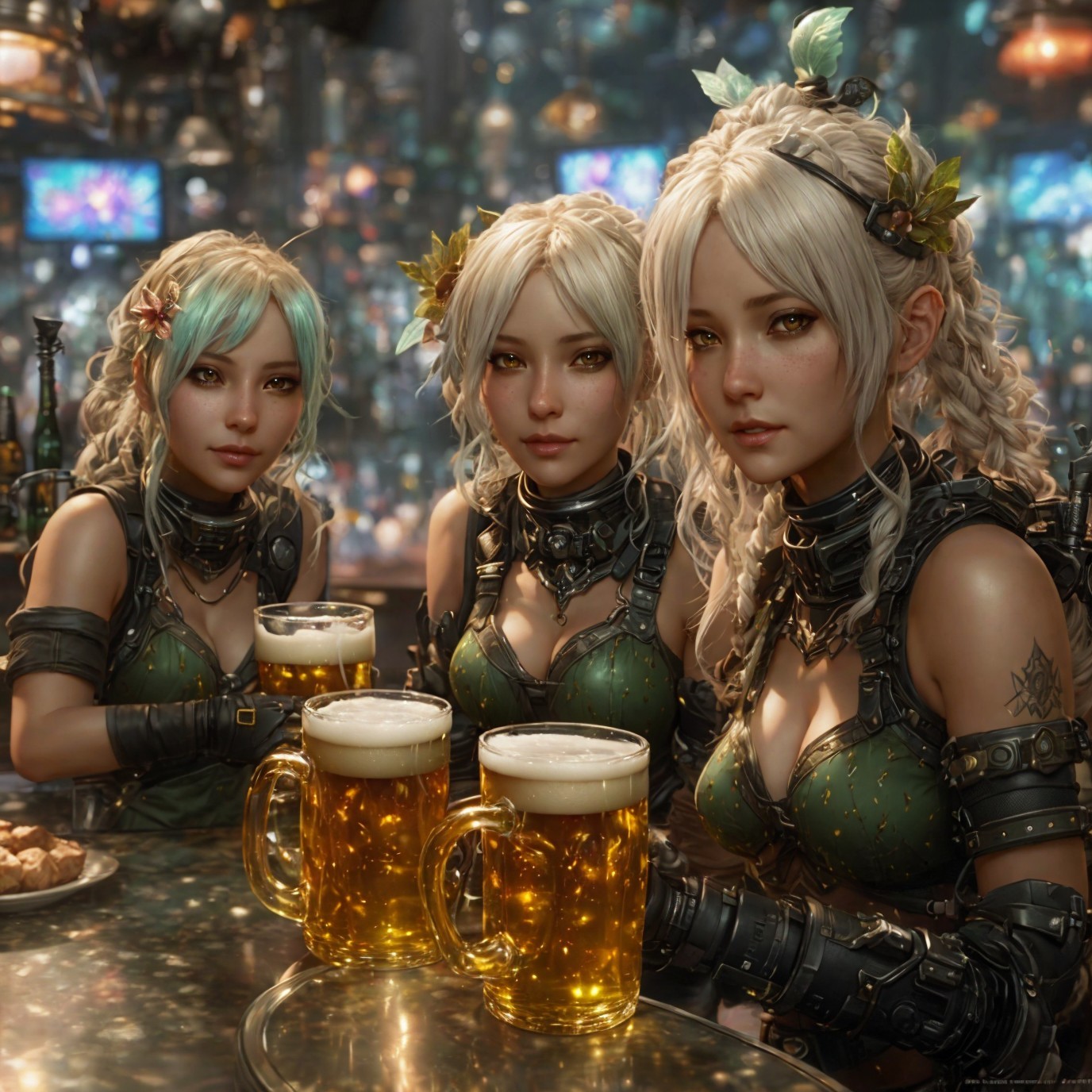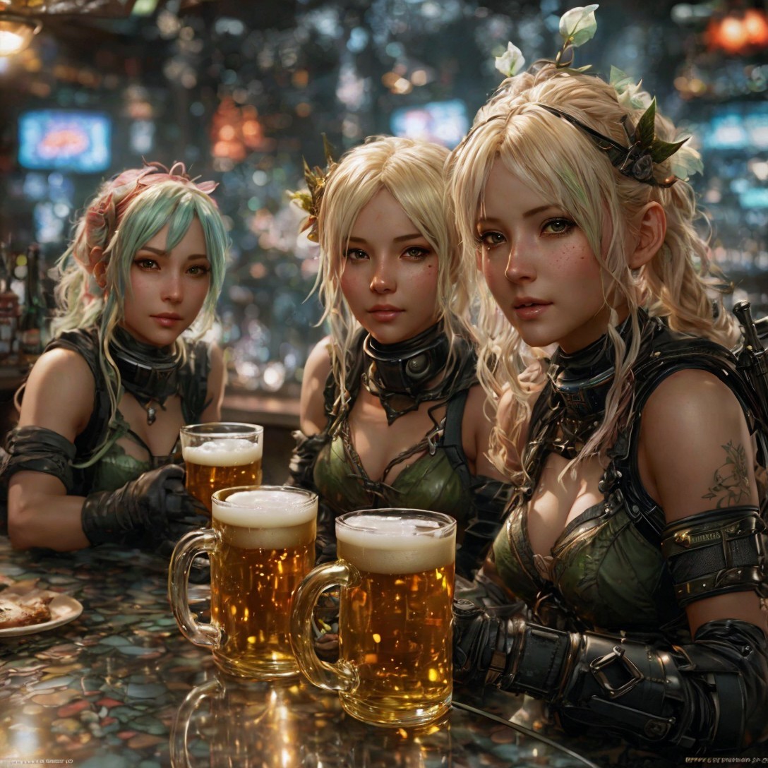 Three futuristic women with silver hair sit at a bar, each holding a large mug of beer. They wear stylish, armored outfits adorned with foliage, set against a vibrant, holographic backdrop.