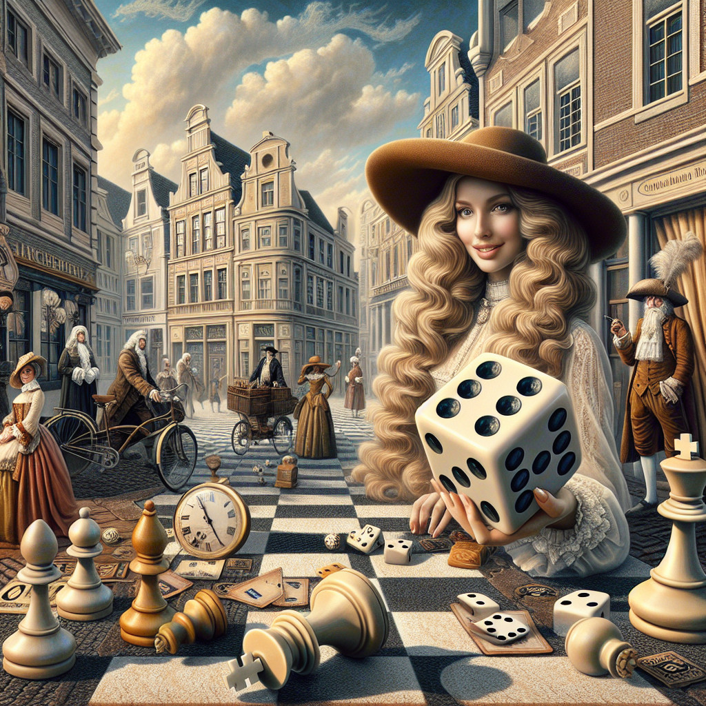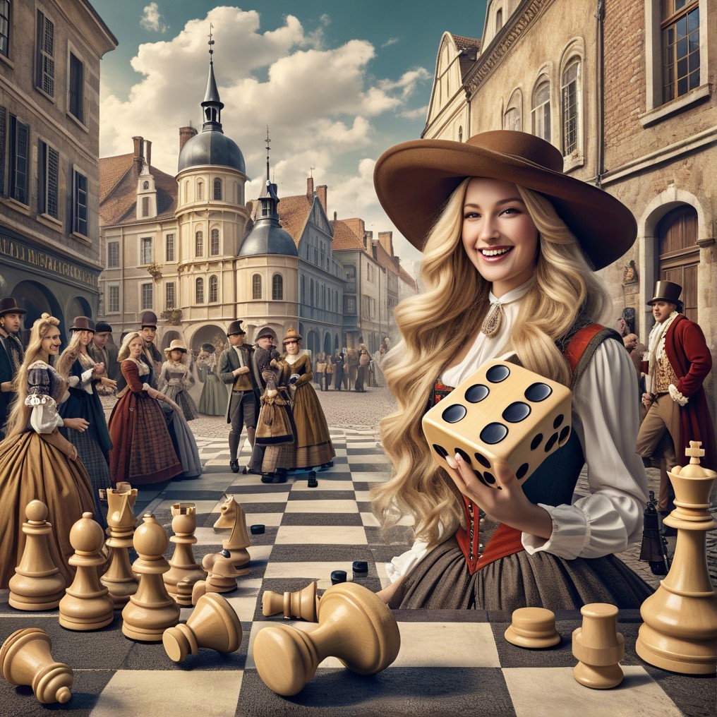 In a historic town square, a woman in period attire presides over a large chessboard with chess pieces and dice, surrounded by elegantly dressed townspeople observing the scene.