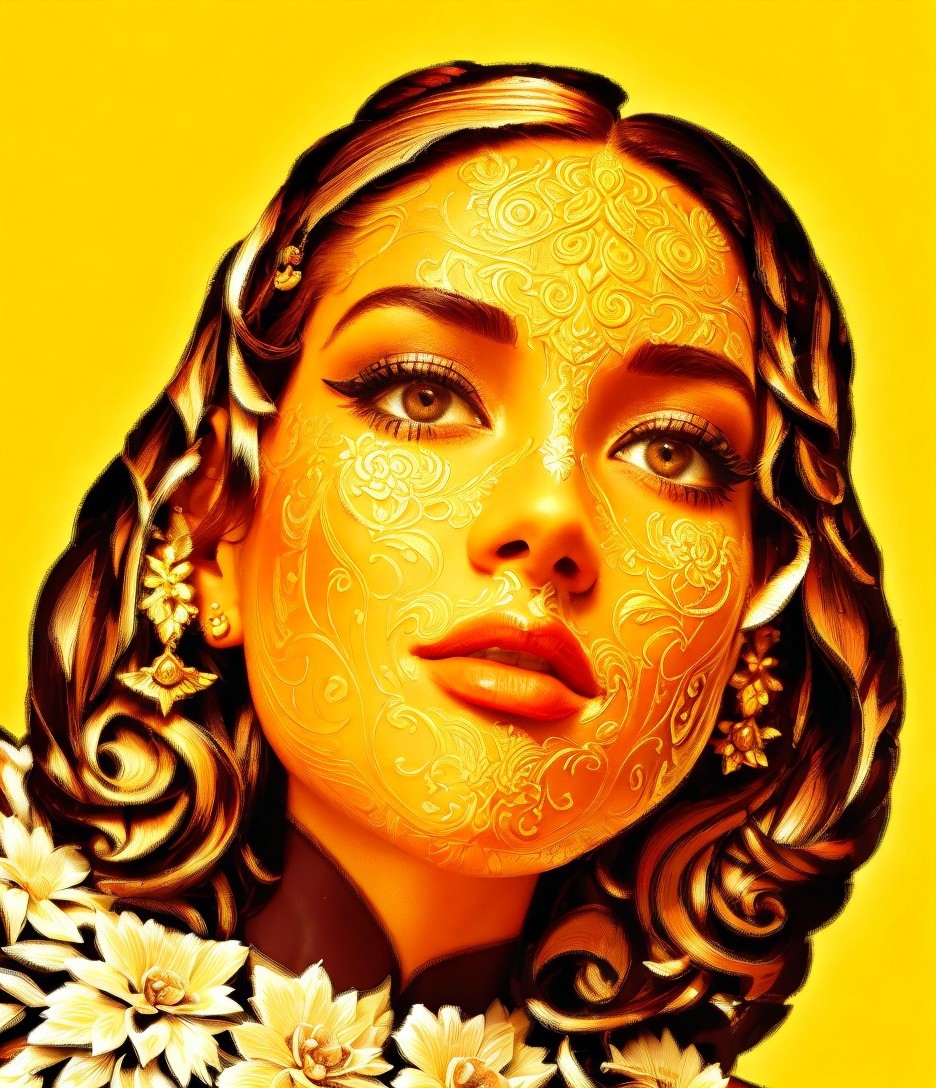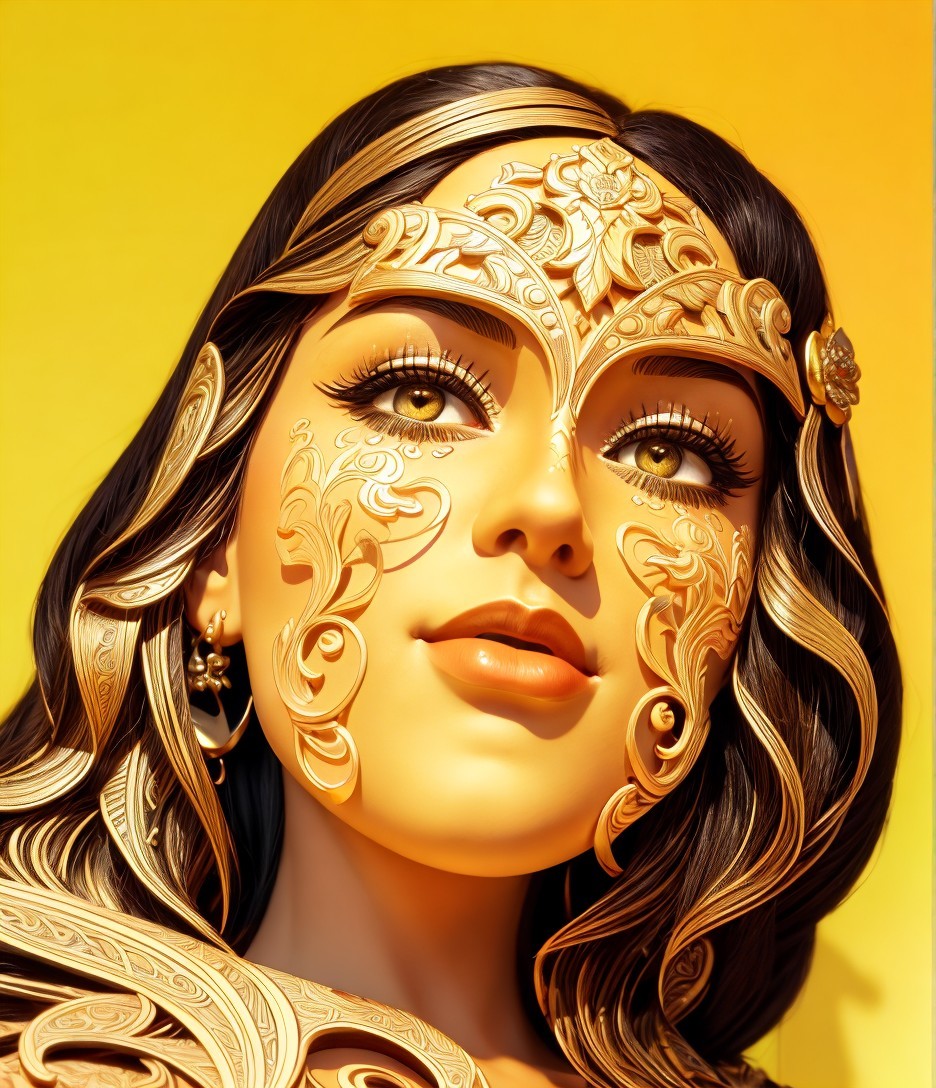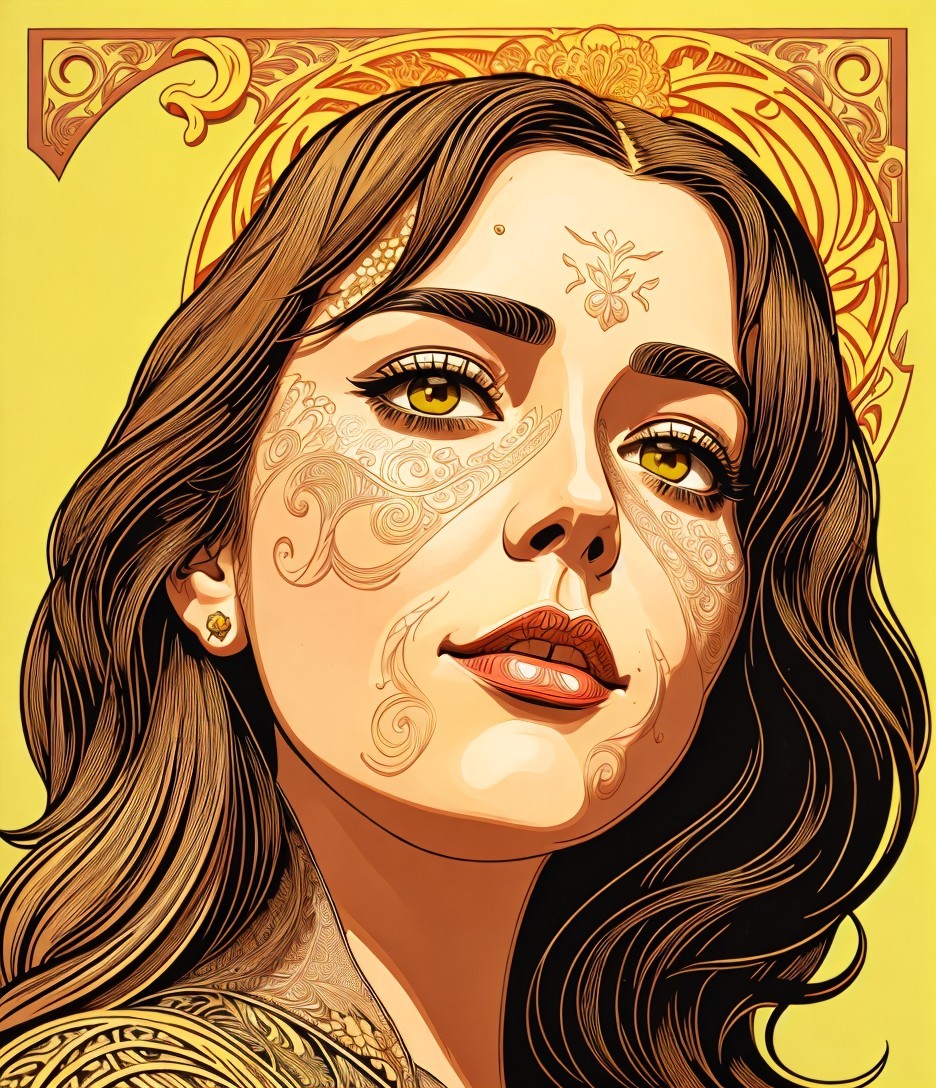 Stylized portrait, arrnouveau illustration, intricate details of lineage, ornamental strokes, stylized lineage, Schreger lines 1.7, 3d effects 1.8, hues, ambient occlusion 1.5, anisotropic filtering 1.7, shadow mapping 1.3, raytraced shadows 1.8, sublime, mood, varnished, triadic color scheme beige yellow brown, complexion 1.4, brightness 1.9, vector 9:5, octane render illustration of female face, headshot, vaporwave 1.7, tints of linocut, style of Geif Darrow,