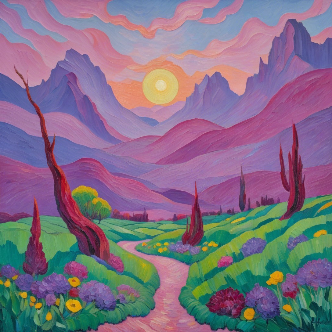 A vibrant landscape painting featuring rolling hills adorned with colorful flowers, winding paths, and majestic mountains under a golden sun, creating a serene and lively atmosphere.