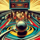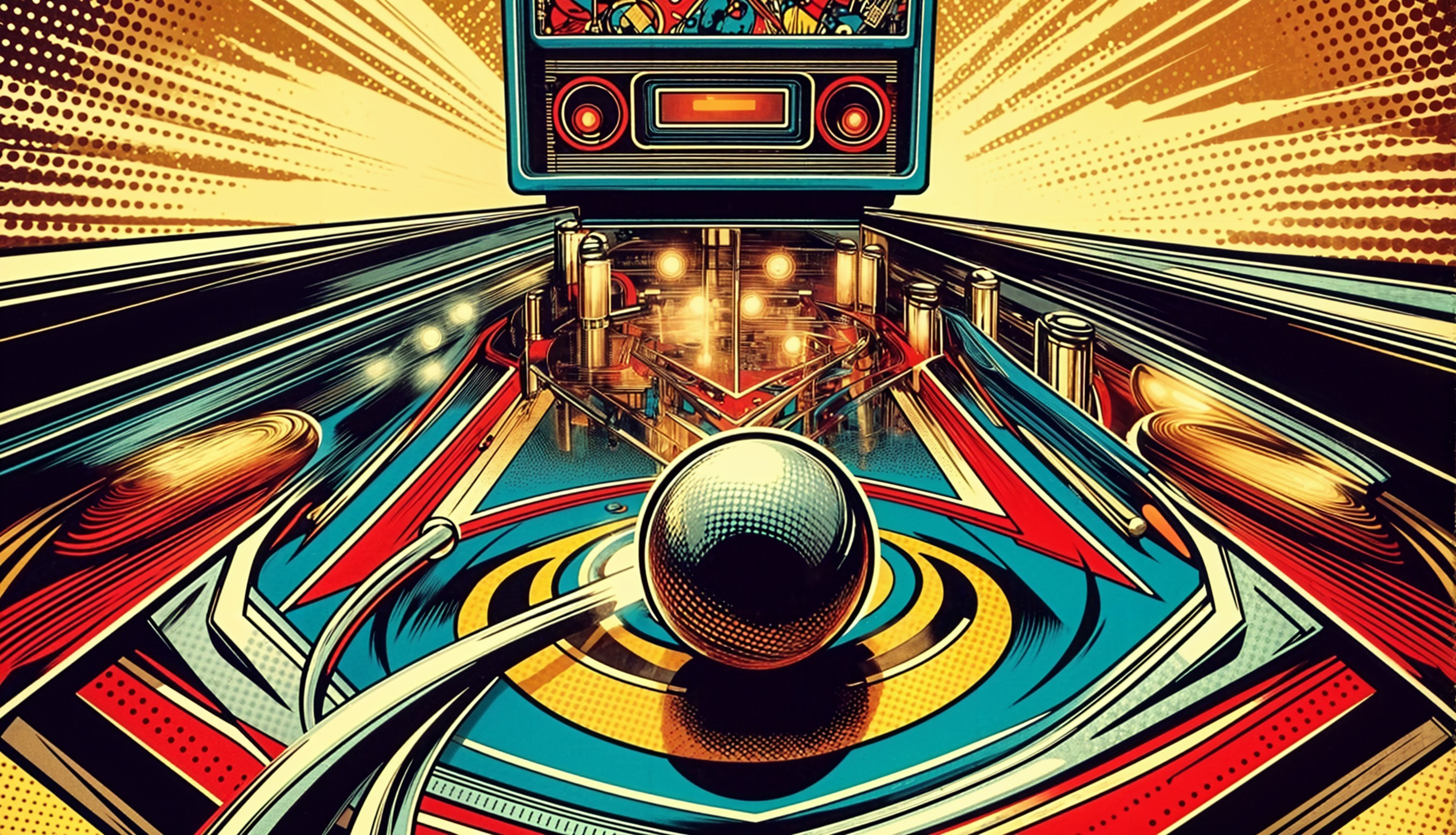 Prompt: Retro comic art illustration of a small pinball ball in sharp foreground, drawn with bold ink lines and vintage halftone textures. The ball is speeding toward a classic metal pinball target with dynamic motion lines. Reflections show muted neon arcade lights. Background slightly blurred with retro halftone shading, 1960s–1970s comic style. Dramatic framing, nostalgic colors, energetic retro arcade vibe