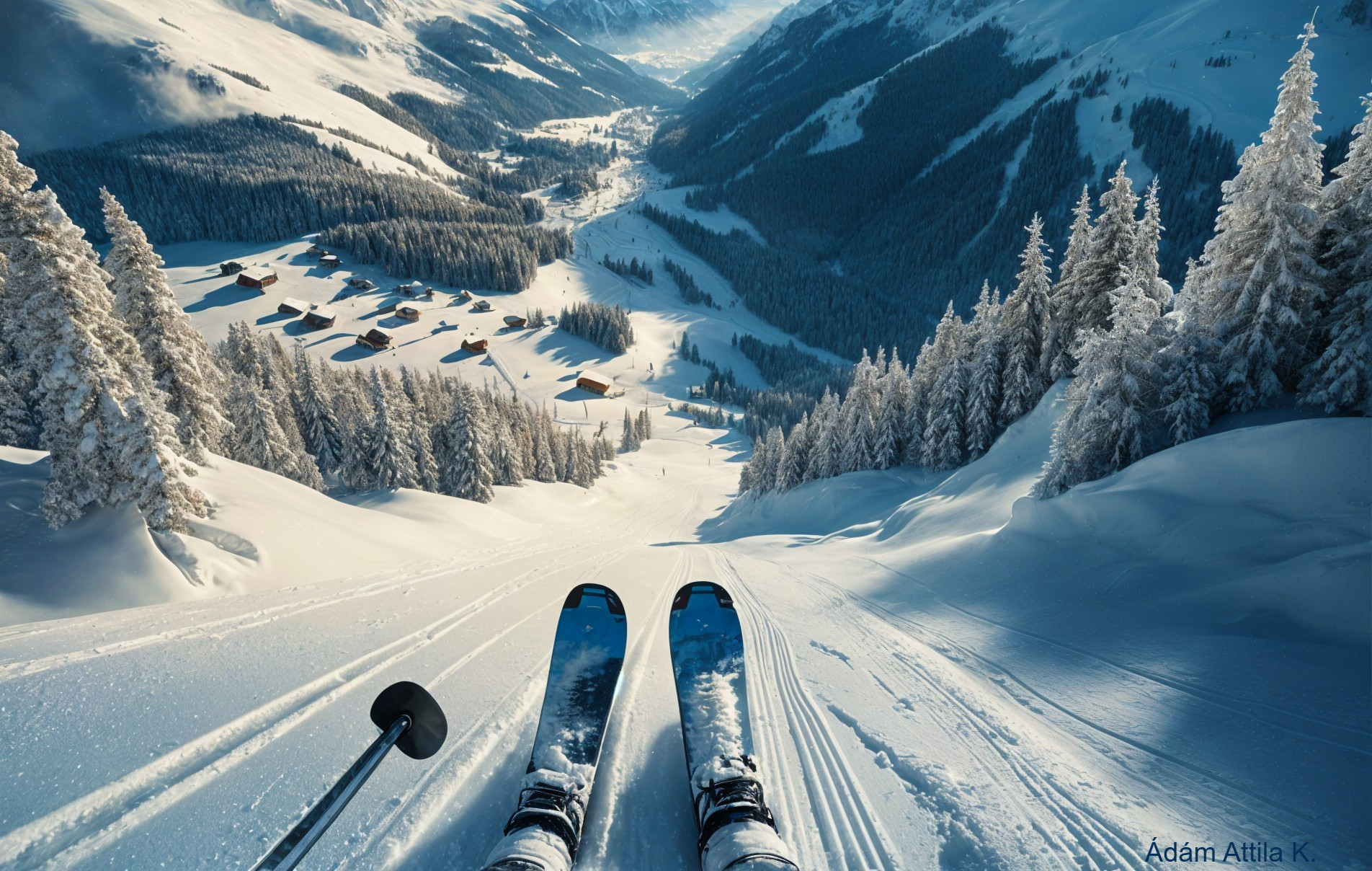 In a photorealistic painting, a skier prepares to ski down a mountain slope. He looks ahead and sees a village in the distance, a snowy landscape with snowy pine trees on either side, and high mountains surrounding the valley. The skier is not visible, only his ski boots and the tip of his ski.