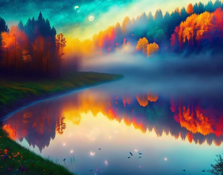 A serene autumn scene with a mist-covered river reflecting colorful trees under a starry twilight sky.