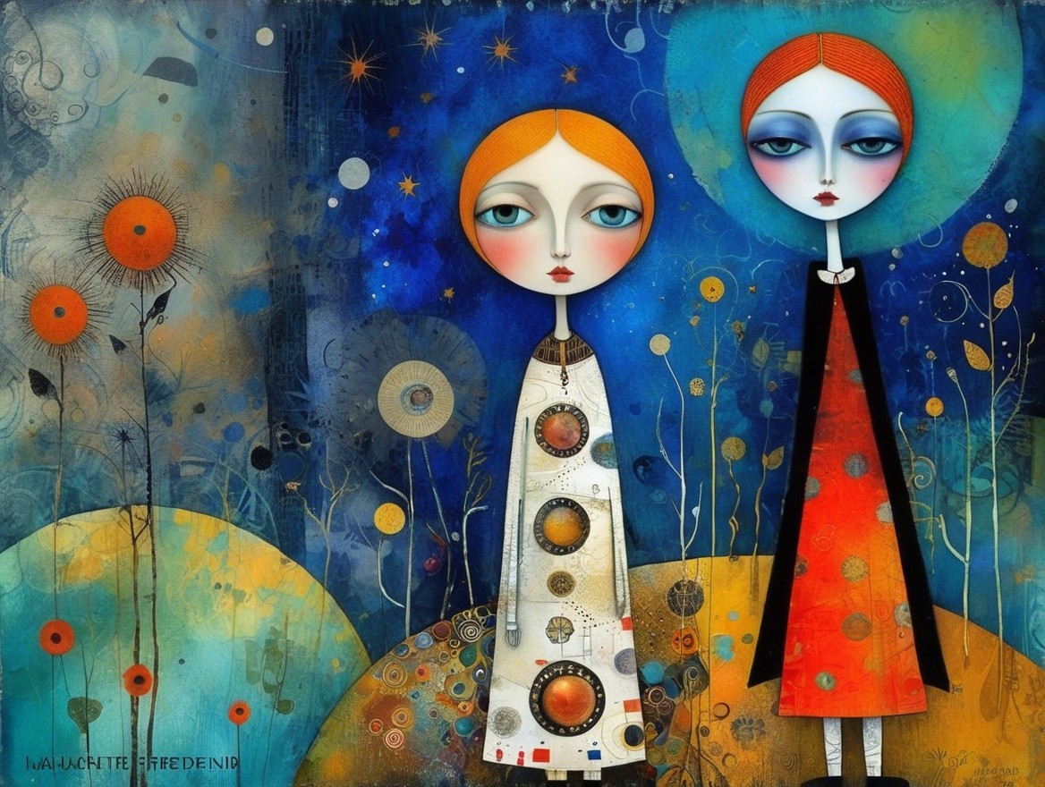 Prompt: ""Whimsical surrealism in unprecedented forms and multiple mysterious figures" Surrealism and figurative art. a blend of the syles of Inge Shuster, Catherine Hyde, Odilon Redon, Angelina Wrona, Gustav Klimt, Duy Huyn, Mandy Disher, Cecilia Frigati. Abstract background with texture, grunge paper, mixed media art, watercolour, oil pastel, set of charcoal with different characteristics, pigments, gold and silver fixatives."