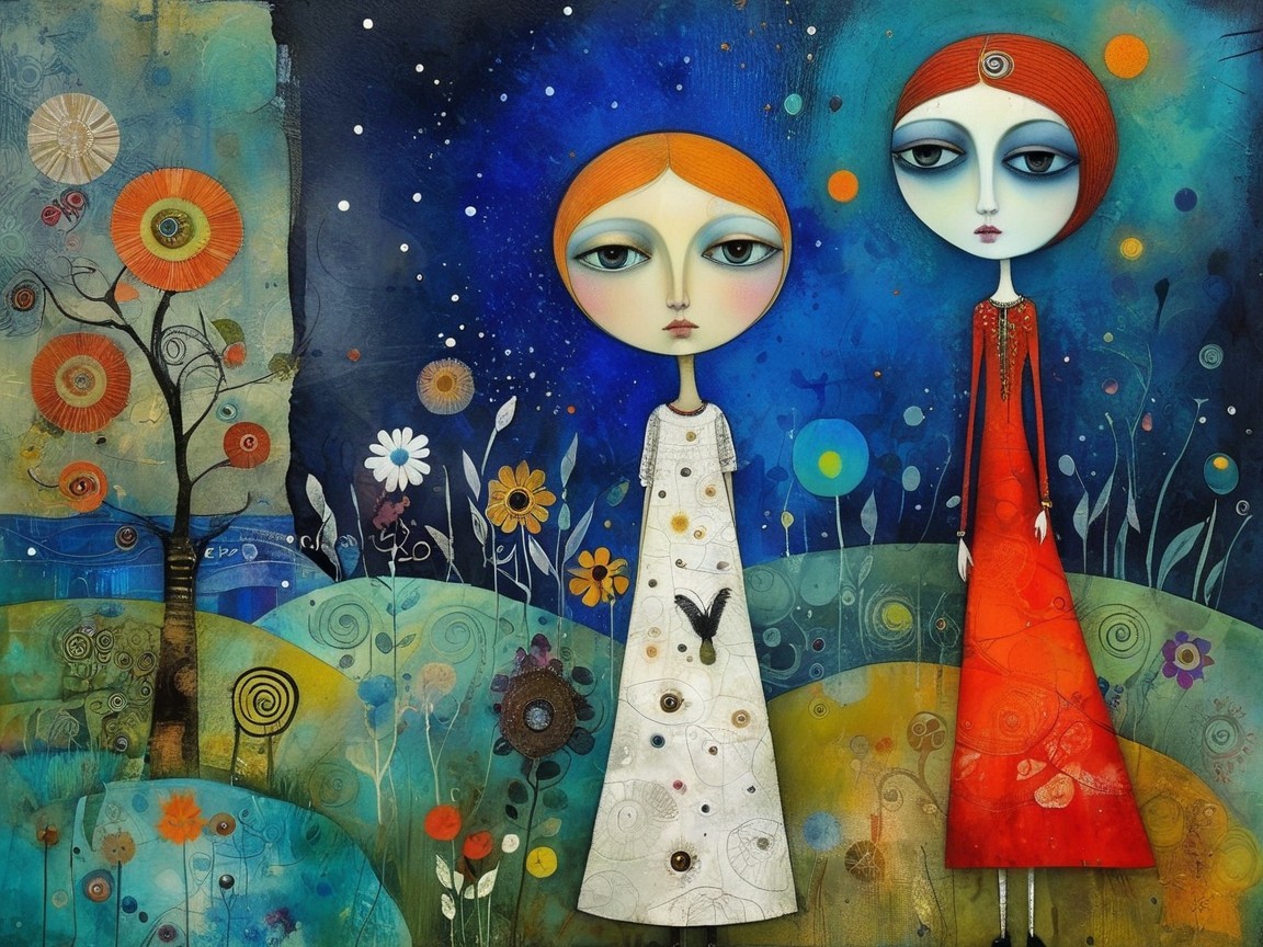 Prompt: "Whimsical surrealism in unprecedented forms and multiple mysterious figures" Surrealism and figurative art. a blend of the syles of Inge Shuster, Catherine Hyde, Odilon Redon, Angelina Wrona, Gustav Klimt, Duy Huyn, Mandy Disher, Cecilia Frigati. Abstract background with texture, grunge paper, mixed media art, watercolour, oil pastel, set of charcoal with different characteristics, pigments, gold and silver fixatives.