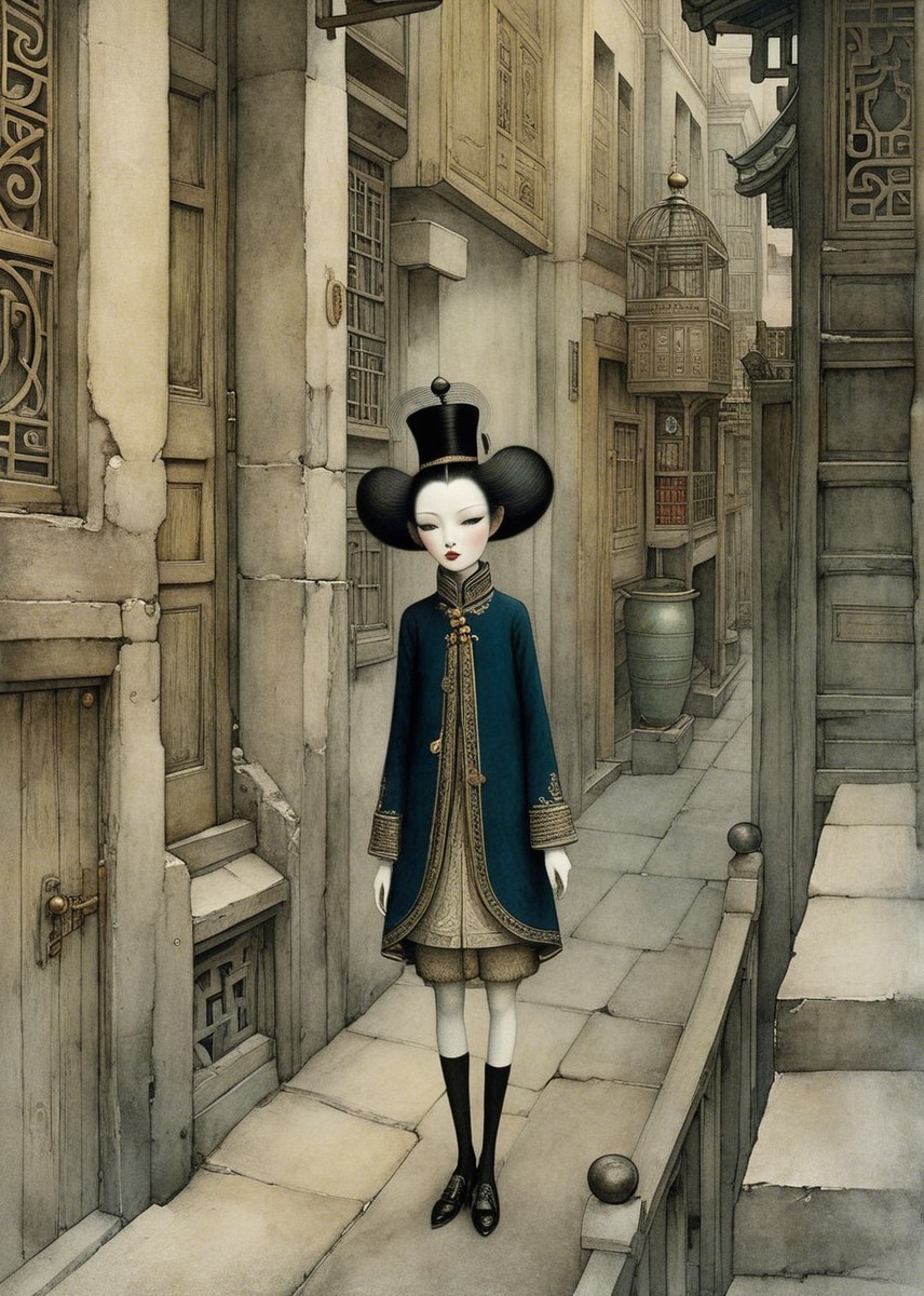 A serene portrait of a woman with long black hair, wearing traditional attire and ornate accessories. She has a delicate expression, set against an intricately designed, muted background.