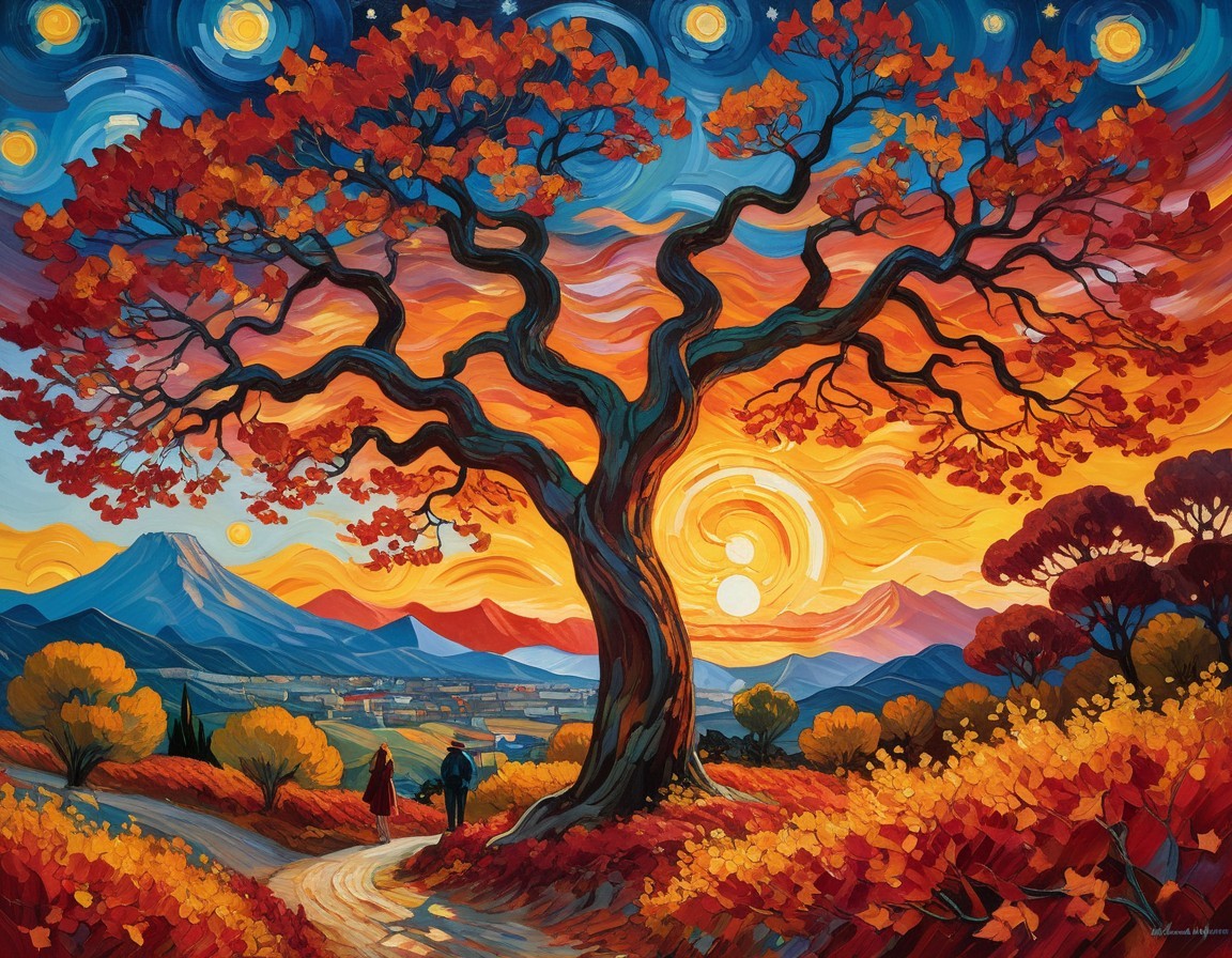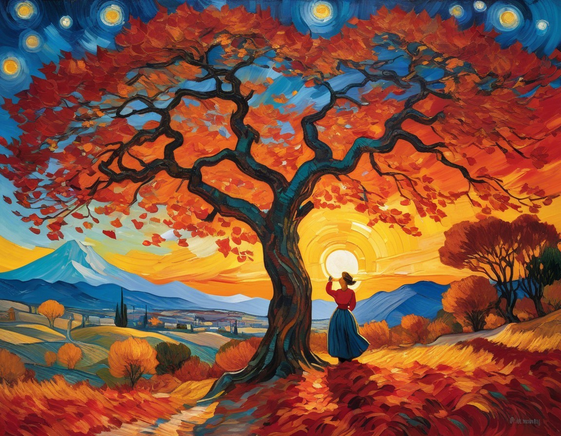 A stunning landscape features a vibrant tree with red leaves under a starry sky. A woman in a flowing red dress stands beside the tree, embracing a glowing sunset, with mountains in the background.
