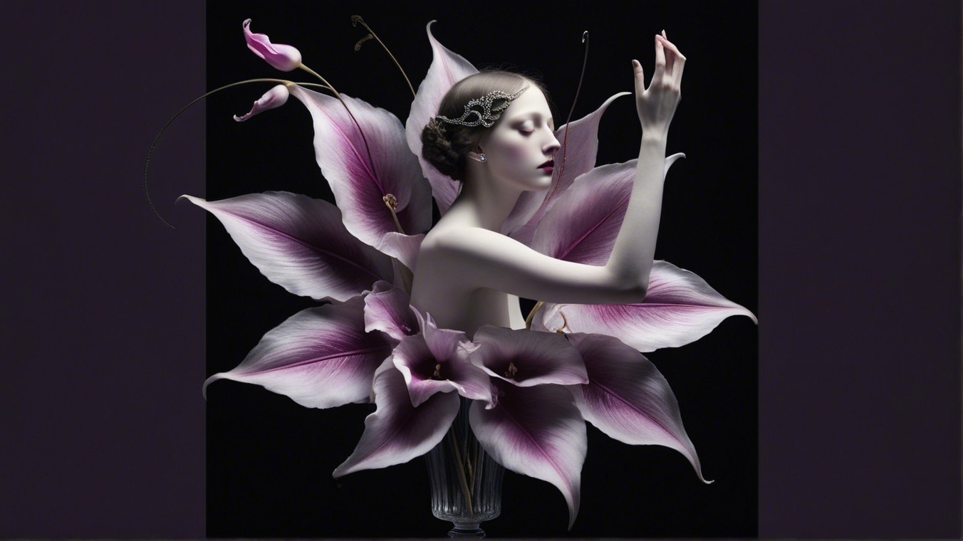 A surreal portrait features a woman emerging from a large, vibrant flower. Her serene expression and elegant pose are complemented by decorative elements, creating a dreamlike atmosphere.