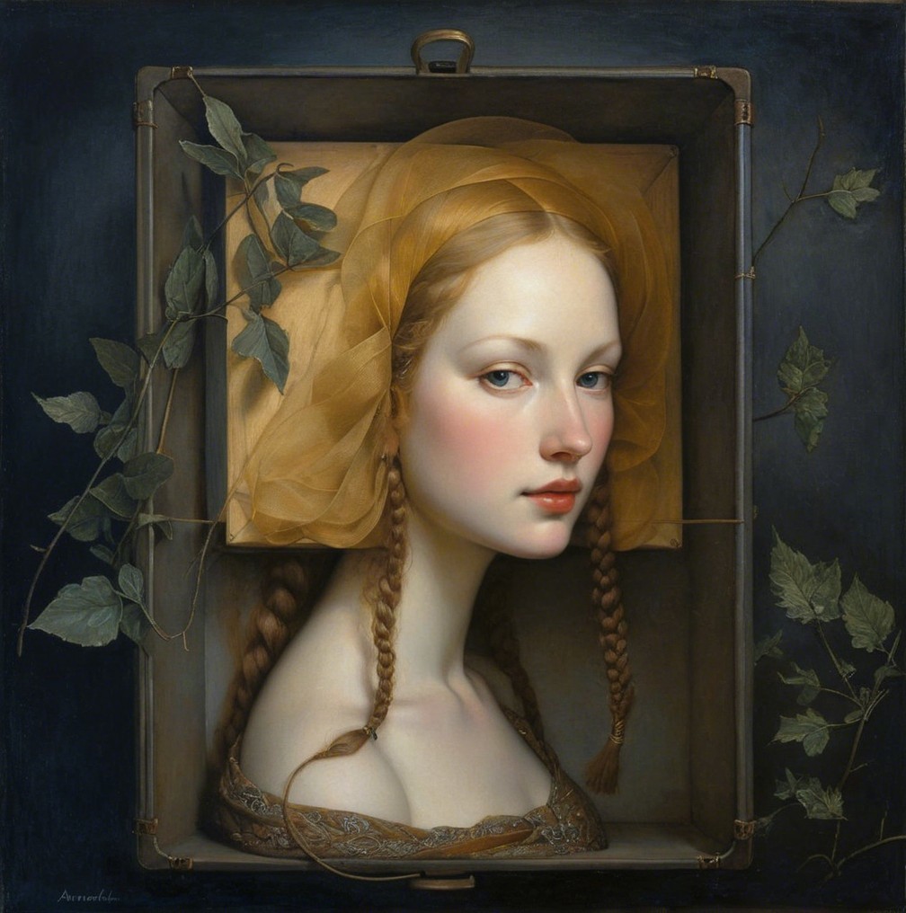 + Prompt:I haven't lived life, I haven't lived love. Just bird's eye view from the sky above". Love is a fragile thread, woven through moments. Inside Pandora’s box. This artwork amalgamates the artistic styles of Michael Parkes,