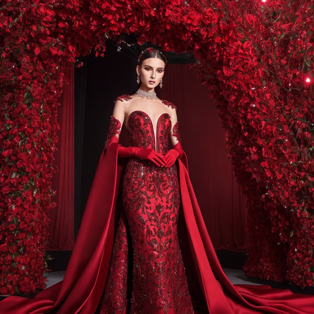 A woman in an elegant red sequined gown with a plunging neckline, gloves, and a draped cape, stands amidst a luxurious rose-themed backdrop.