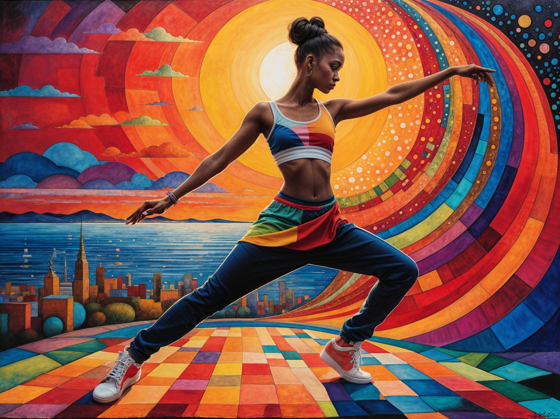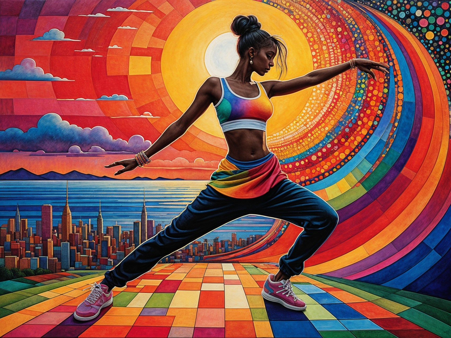 The vibrant artwork features a dynamic figure in mid-pose, hip hop dancing, wearing a colorful ensemble and sneakers, set against a kaleidoscopic background of swirling patterns and bold colors, exuding energy and movement.