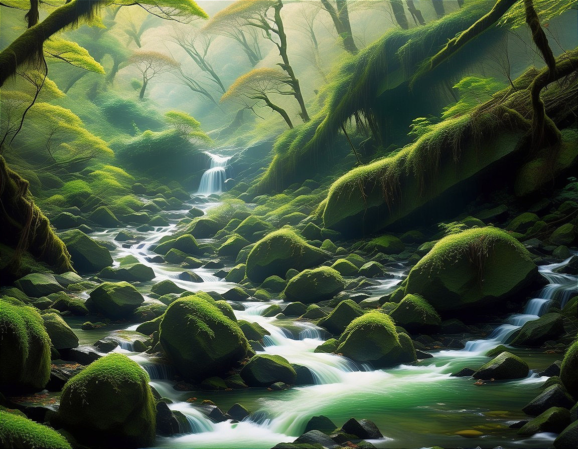 A serene forest scene with a cascade, lush greenery, moss-covered rocks, and ethereal mist.