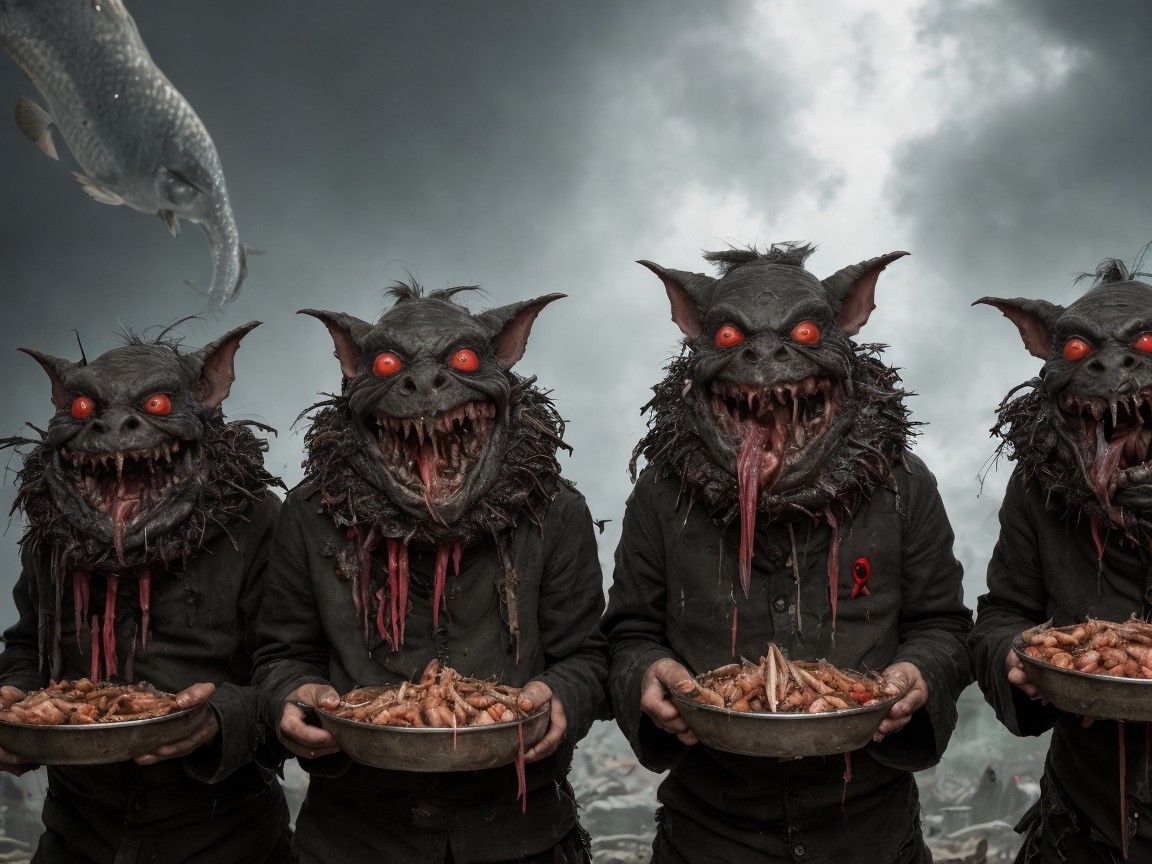 A wide outdoor shot captures four bizarre goblin-like creatures, each wearing a dark gray hooded tunic, with their heads adorned with menacing faces featuring oversized red eyes, pointy ears, and an open mouth full of sharp teeth, with some having long tongues protruding. Their collars are a dark, hairy, twig