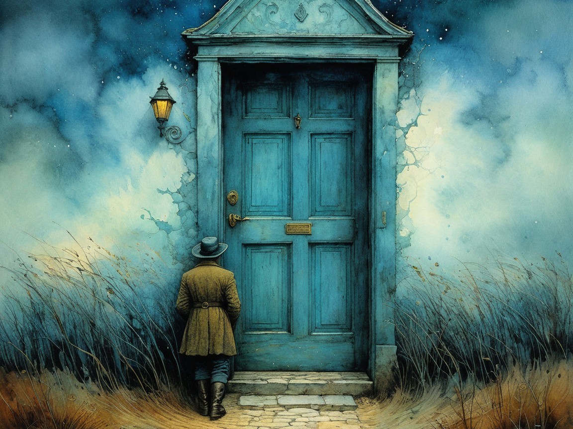 A lone figure in a red coat stands before a vibrant blue door overlooking a serene ocean at dusk, with two moons illuminating the sky, blending mystery and tranquility.