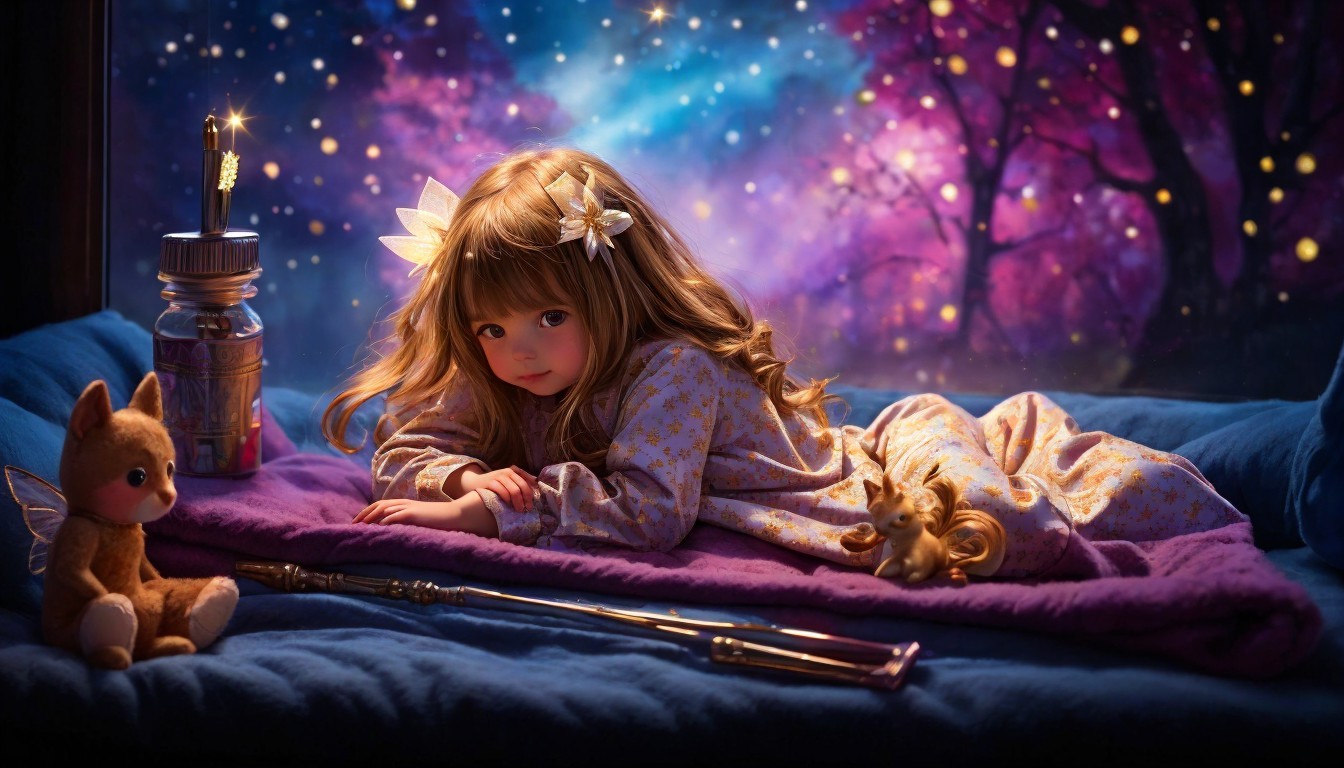 A young girl reads a book by a window with a Christmas tree and a starry night sky backdrop.