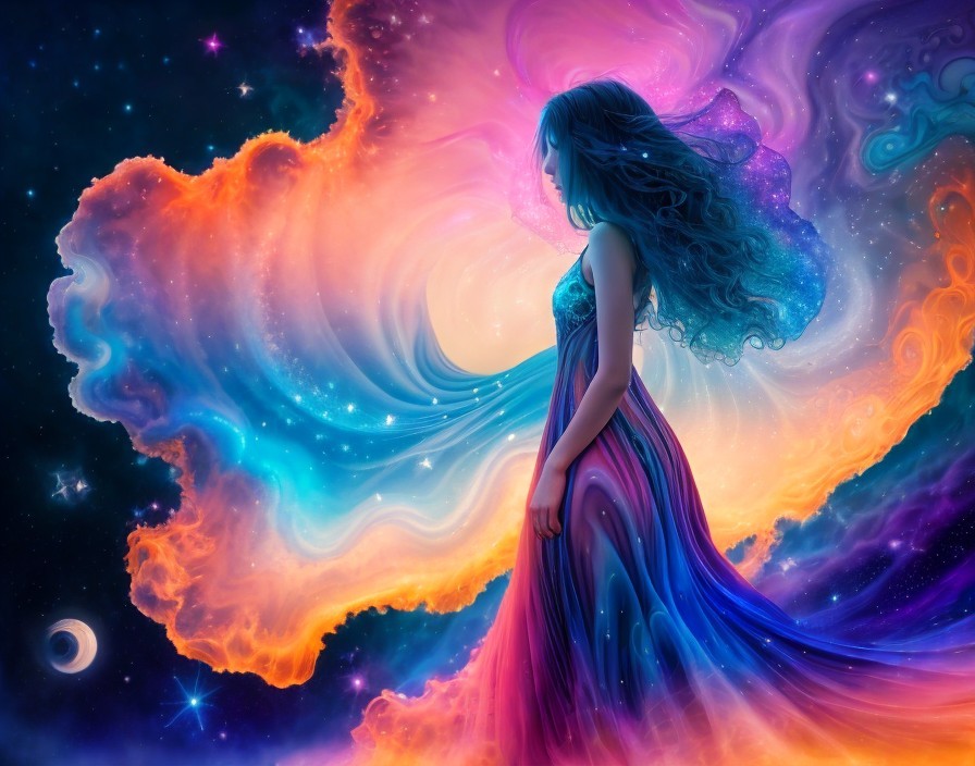 An ethereal animated woman in a flowing gown gazes at a starry night sky, her hair and dress merging with the cosmos.