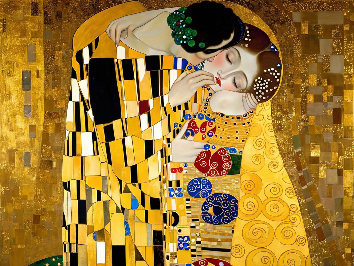This iconic painting depicts a romantic embrace, featuring intricate patterns in gold and vibrant colors. The couple is enveloped in shimmering textures, conveying passion and intimacy.