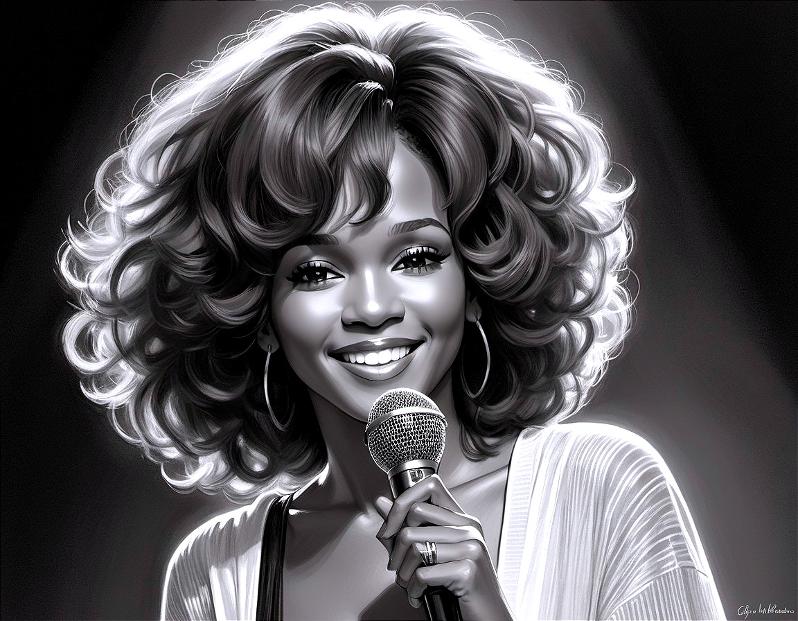 Monochrome illustration of a Whitney Houston with voluminous curly hair holding a microphone, exuding charm and confidence.