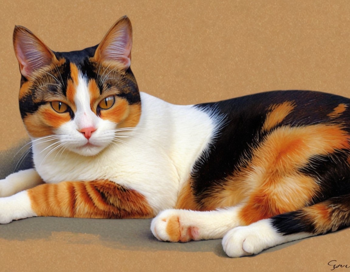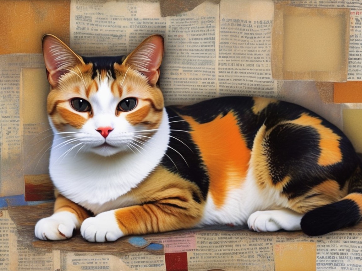 A photorealistic cat with a calico pattern sits gracefully on an open book, wearing a stylish plaid outfit. The background features layered vintage papers and text, for Halloween