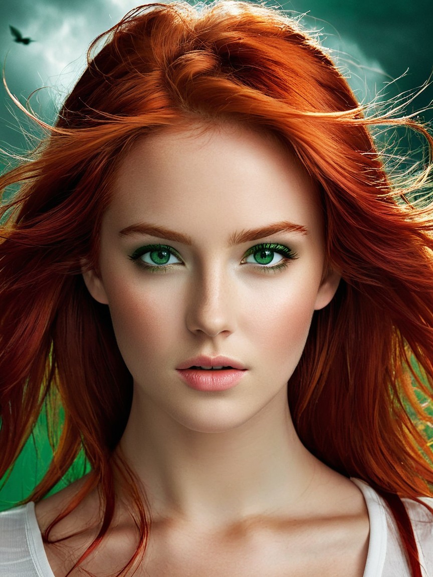 A striking portrait of a woman with vibrant red hair and green eyes, her expression is calm yet captivating, set against a dramatic backdrop of swirling colors.