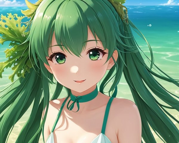 A charming catgirl adorned in vibrant seaweed, blending magical elements with a whimsical underwater theme. Her playful demeanor and enchanting features create a delightful and captivating character.