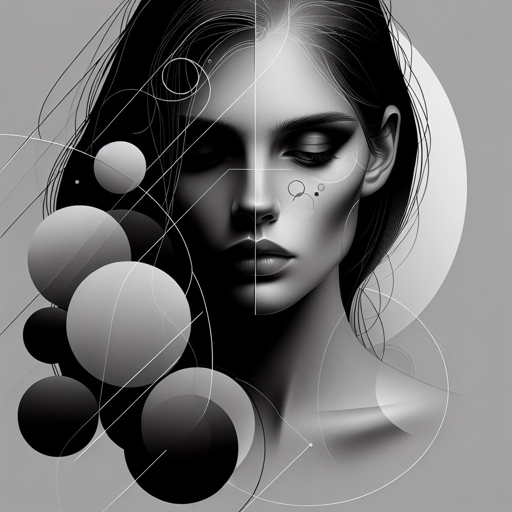 A striking monochrome portrait of a woman features smooth contours and captivating facial symmetry, intertwined with abstract geometric shapes and circles, creating a modern artistic aesthetic.