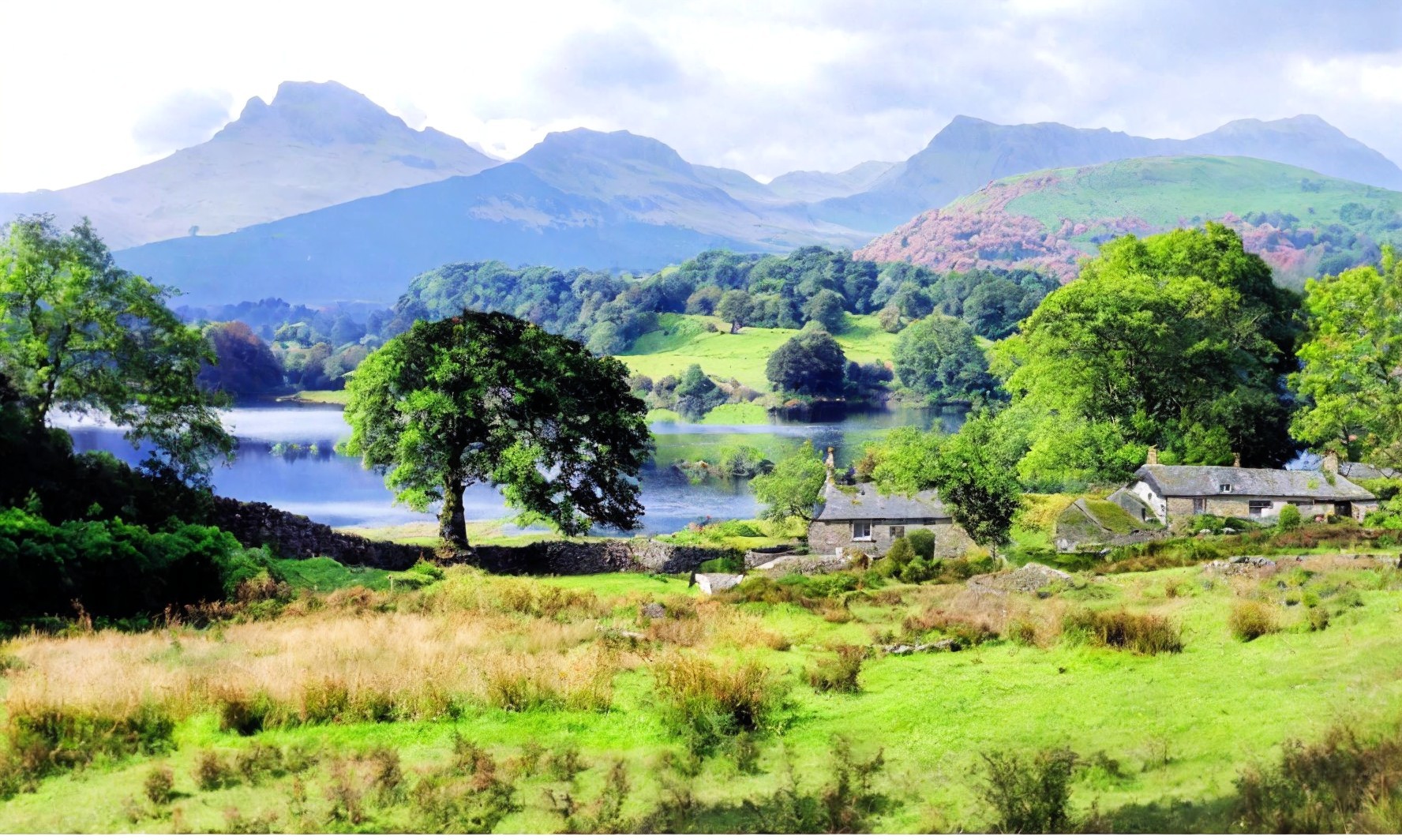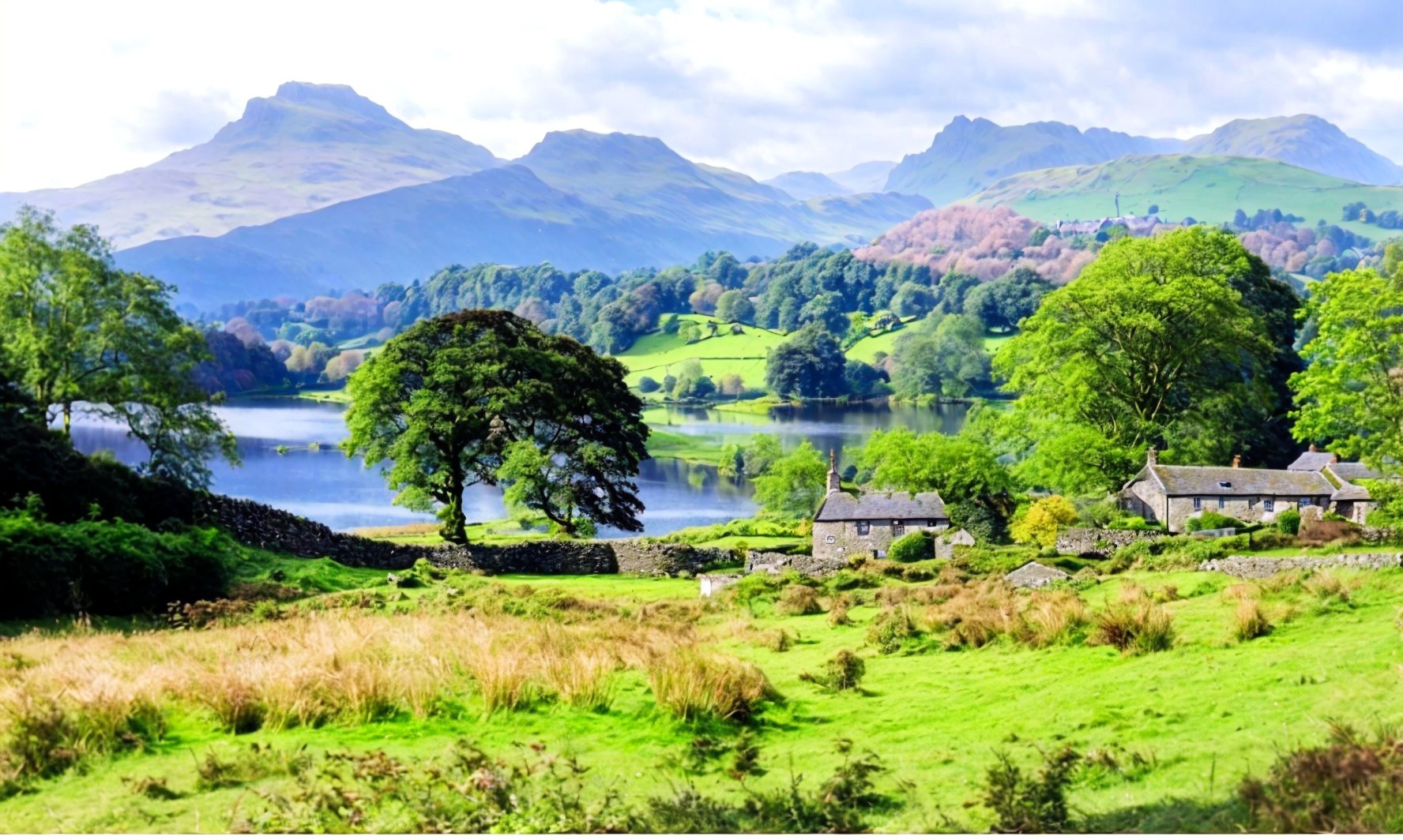 A serene landscape with a reflective lake, rolling hills, greenery, quaint houses, and a clear sky.
