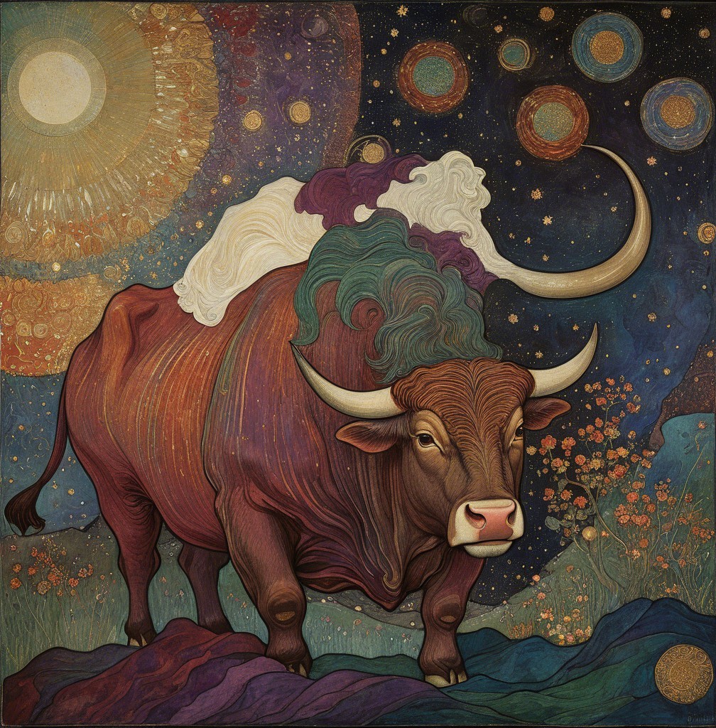 A colorful, stylized cow stands against a cosmic backdrop of swirling patterns, stars, and a glowing sun, blending nature and art in vibrant hues of purple, blue, and gold.