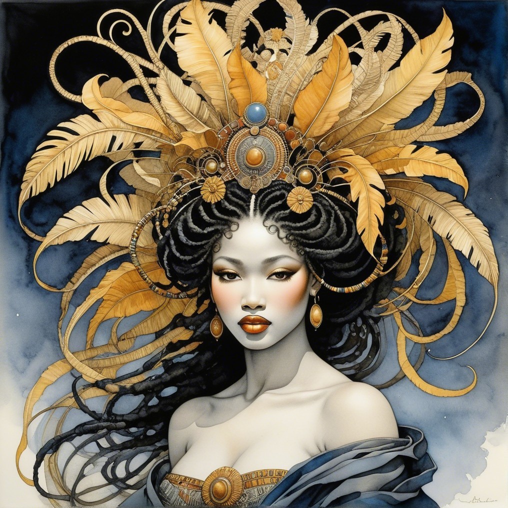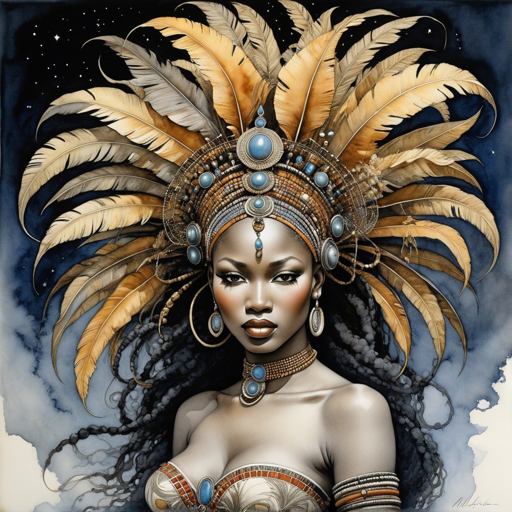 A striking figure radiates confidence, adorned in golden jewelry and a flowing skirt. Her elaborate, curled hair resembles a majestic crown, set against a celestial backdrop.