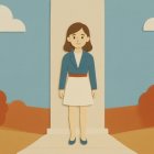 A young girl stands in a serene landscape, featuring bold colors. She wears a green jacket, white shorts, and black shoes, with stylized trees and vibrant skies in the background.