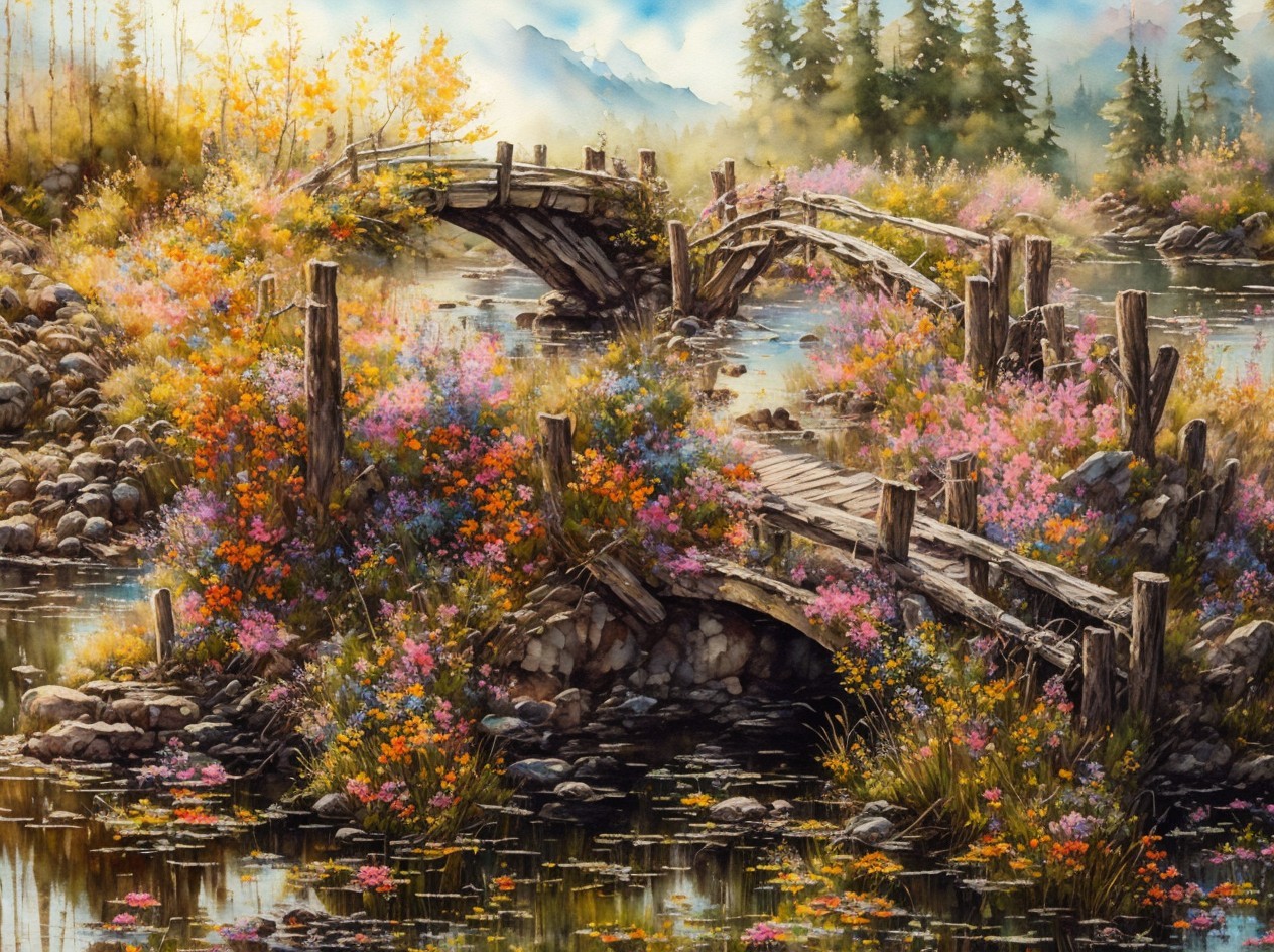 A serene landscape with a rustic wooden bridge over a calm river, surrounded by colorful flowers and autumnal trees, with mountains in the backdrop.