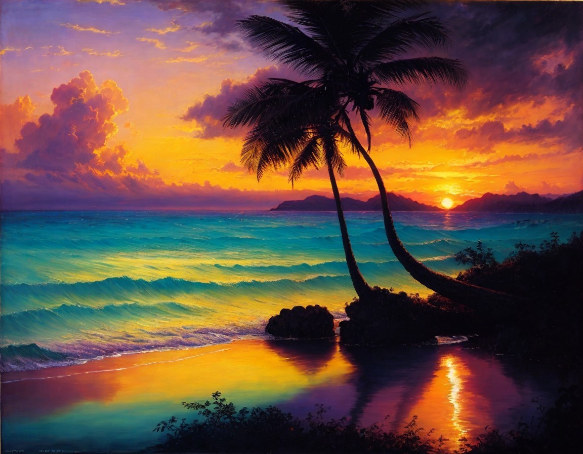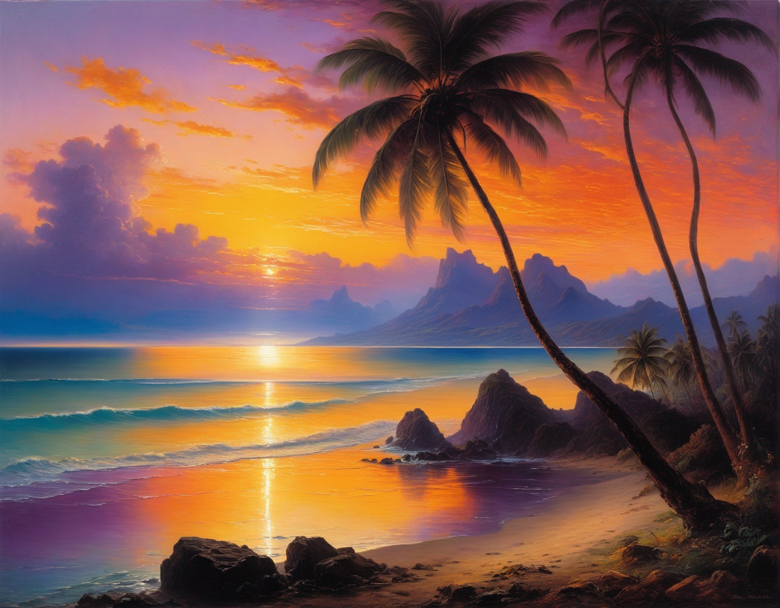 Prompt: Oil on canvas, wide angle landscape view, a magnificent sunset at Tahiti. Glowing with vibrant hues, glowing with vibrant hues, sky transitioning from warm orange to deep purple. Perfect composition. By Peter Paul Rubens. William Turner. By Pierre-Auguste Cot.