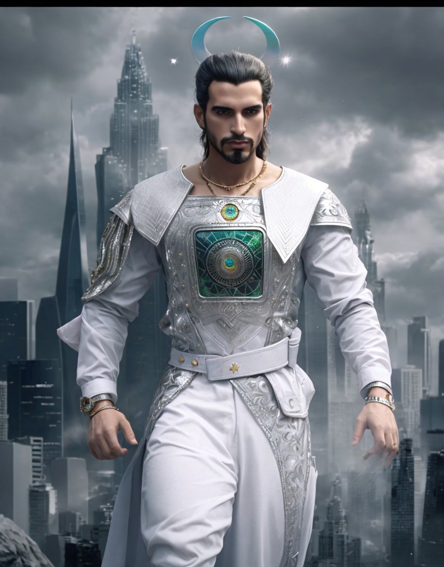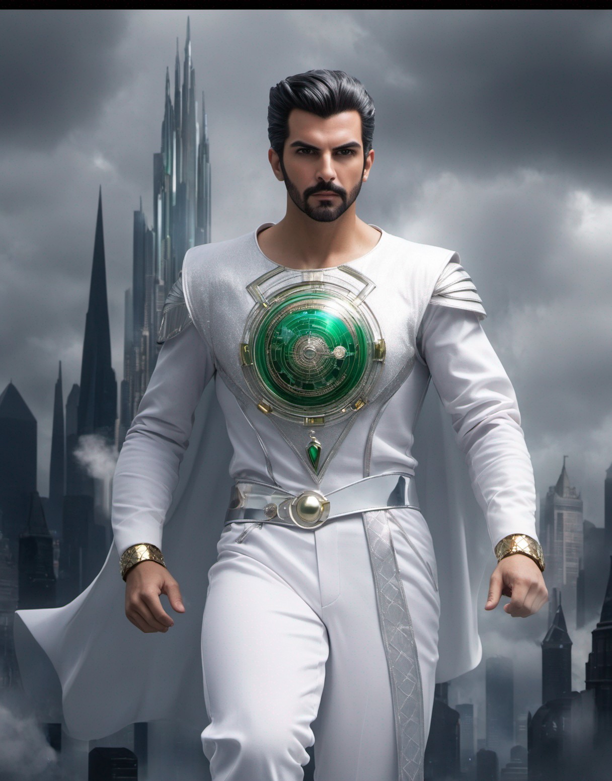 A heroic figure in a futuristic, white outfit featuring a globe in the chest area, stands confidently against a dramatic cityscape with tall structures under a cloudy sky.