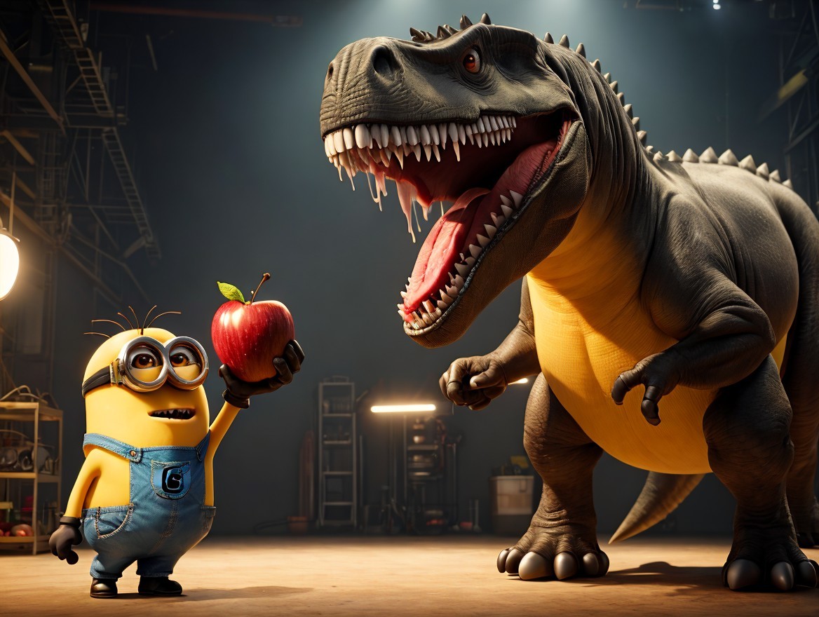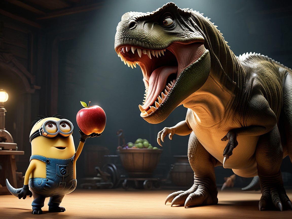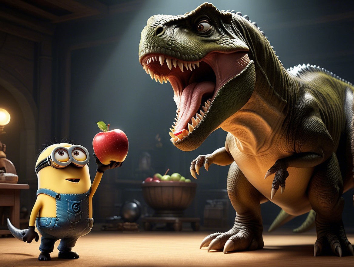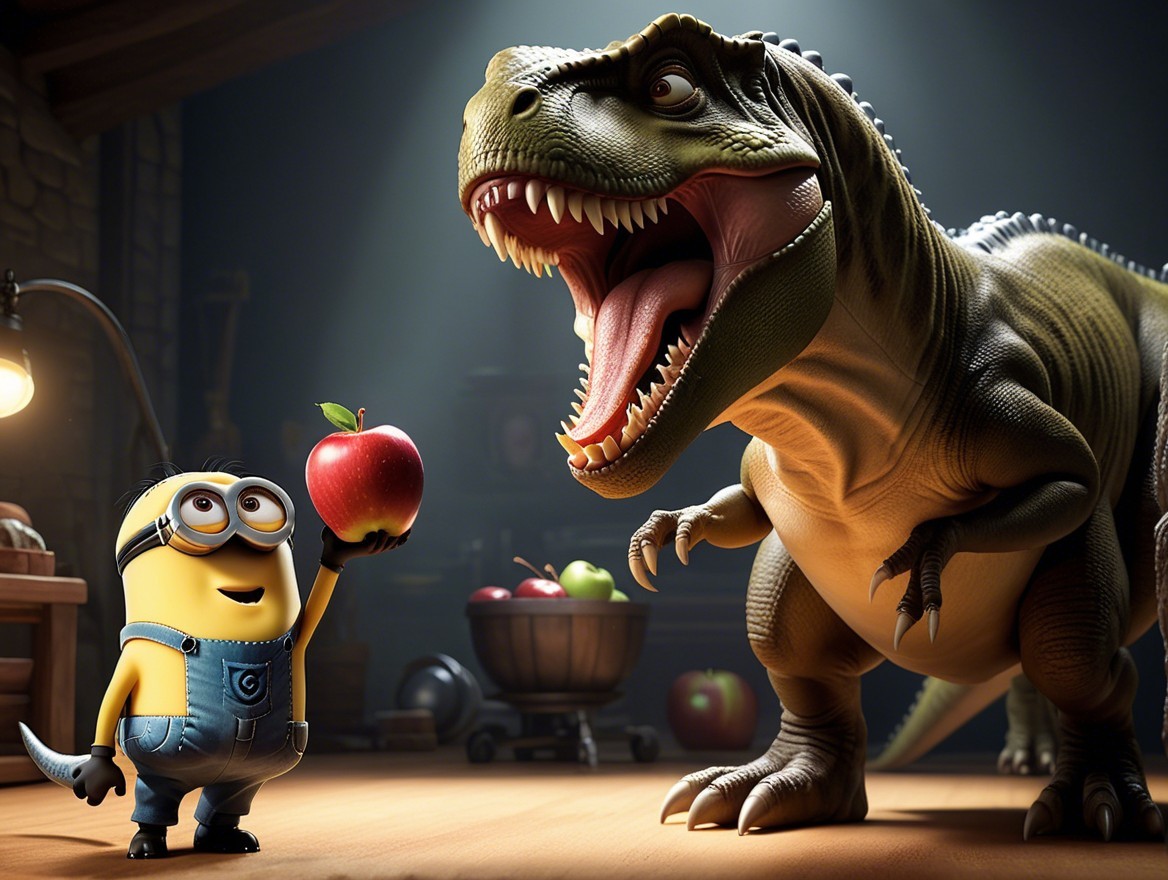 A small, Minion offers a T-Rex an Apple, before realizing that this Dinosaur is Not a Vegetarian.