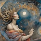 A serene woman adorned with flowers gazes upward, surrounded by vibrant parrots and lush foliage. A soft moonlight casts a gentle glow, enhancing the enchanting, dreamlike atmosphere.