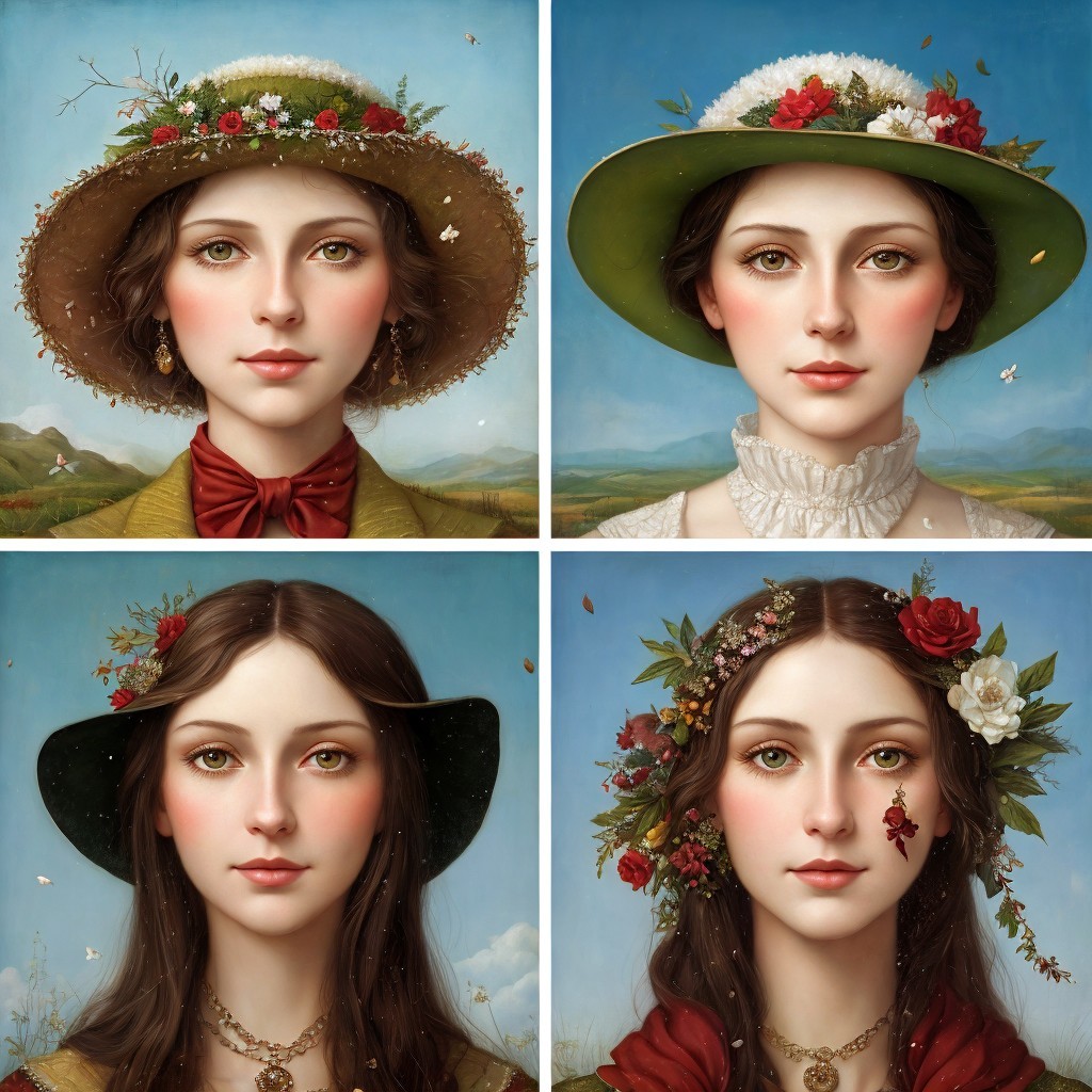 Four portraits of women in various hats, each reflecting a different season. Their serene expressions and soft colors create a harmonious, timeless beauty, emphasizing nature and femininity.