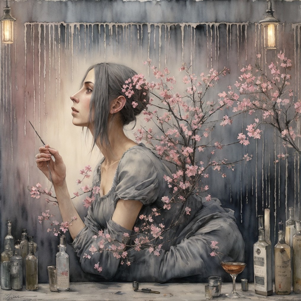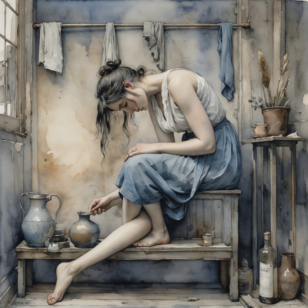 A young woman in a flowing blue dress sits on a wooden stool, focused on a small object in her hands. Soft natural light illuminates the serene room, filled with delicate pottery and vintage decor.