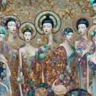 A striking artwork featuring a group of elegantly styled women adorned with elaborate patterns and floral motifs, set against a shimmering, ornate background in rich colors.